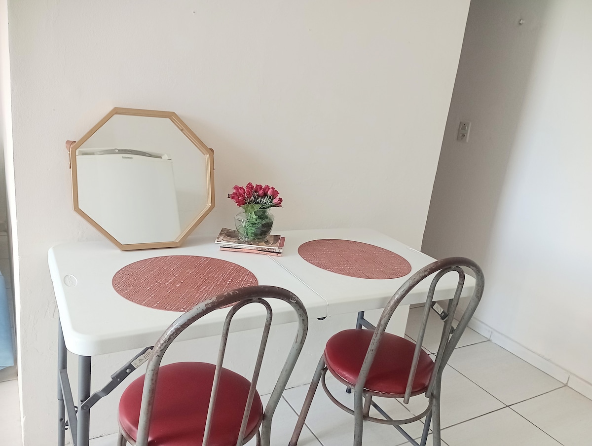 Lugar funcional, privativo e com cozinha completa, assim o hóspede irá economizar bastante em relação a alimentação. Bem pertinho de mercado, padaria, farmácia e academia para dar mais comodidade. São aproximadamente 15 minutinhos de caminhada até a praia ou um Uber para chegar mais rápido. E para quem esteja a fim de esquecer os problemas do dia a dia é uma boa pedida. Um jardim com rede, churrasqueira (tipo porquinho) e chuveiro. Vale a pena curtir!