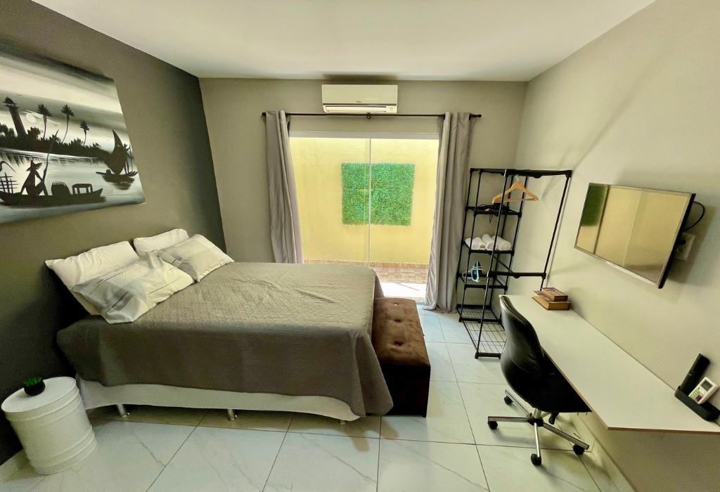 Lindo espaço para seu lazer ou trabalho. INTERNET privada de alta velocidade. Smart TV 50 polegadas Samsung QLED 4K 2024, Modo Game, Som em Movimento, Alexa, antena digital (canais abertos). Monitor de apoio na área de trabalho. Home theater, cafeteiras, micro, grill, torradeira e liquidificador. Máquina de lavar digital Samsung. Área de lazer com piscina, freezer e churrasqueira de uso comum do Condomínio. O check-in pode ser feito em qualquer horário, a partir das 15h.