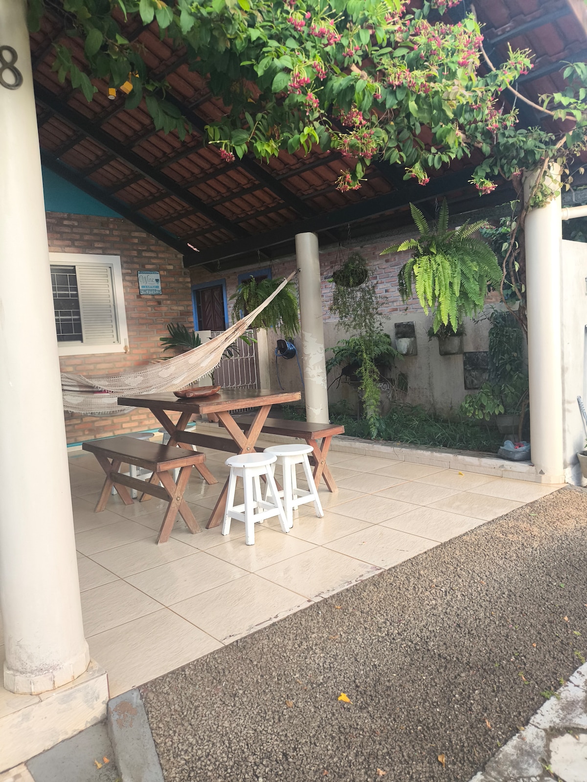 Nossa suíte conta com ar condicionado, uma cama de casal, banheiro privativo e uma pequena área de estar. A decoração é moderna e acolhedora, com toques de natureza que fazem você se sentir em casa. Desfrute de um café da manhã no jardim decorado, rodeado por árvores e flores que criam um ambiente sereno.