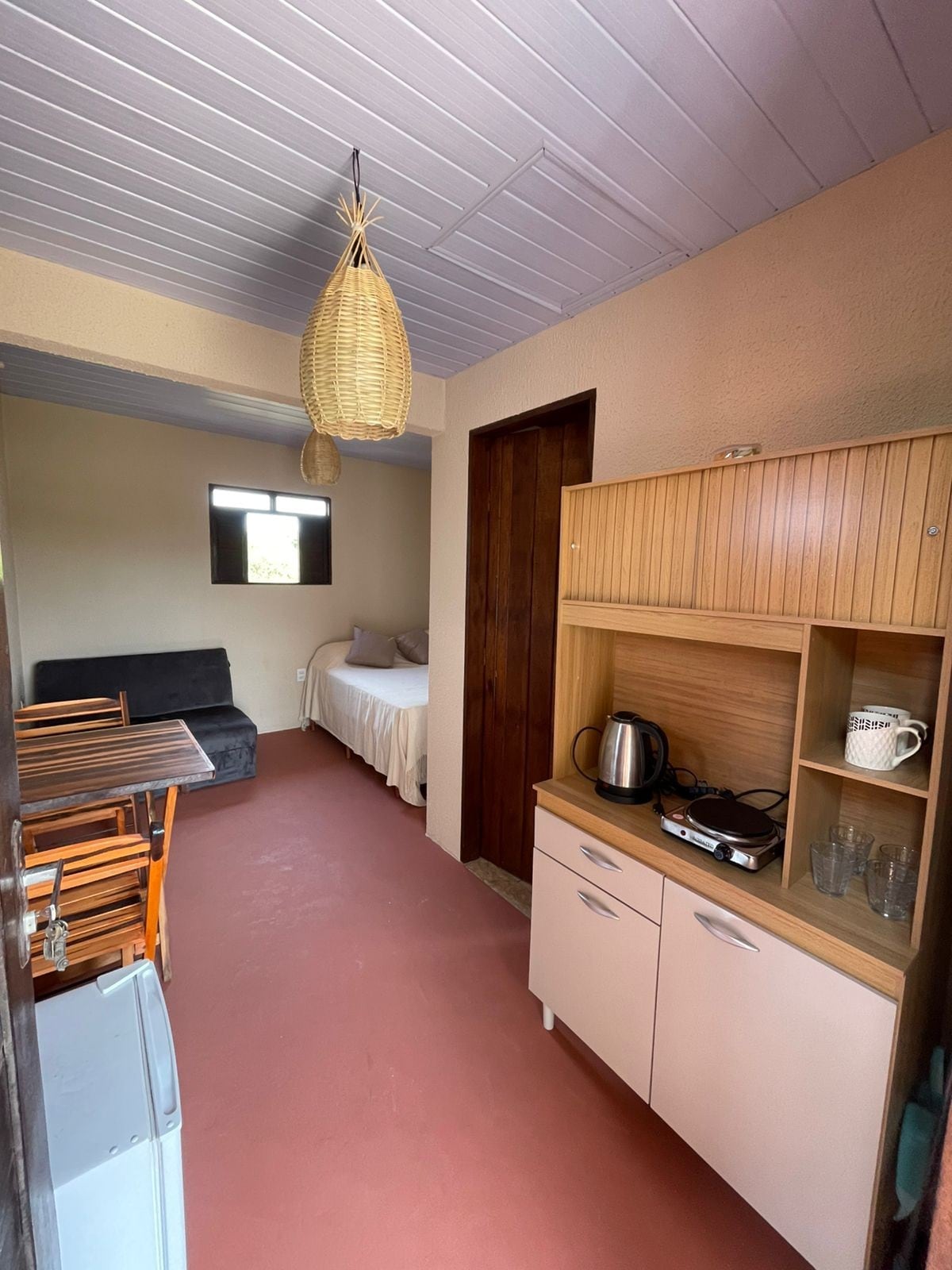 Studio with mezzanine, private entrance, parking space, and security camera at the entrance. Equipped with a fridge and a water dispenser. It features a comfortable queen-size bed on the mezzanine and a sofa bed on the lower floor — perfect for couples or small families. 📍 Great location: just 950 meters from the famous Ponta do Santo Cristo Beach, known as the best beach in the area for kitesurfing and water sports. Perfect for those seeking convenience, comfort, and easy beach access!