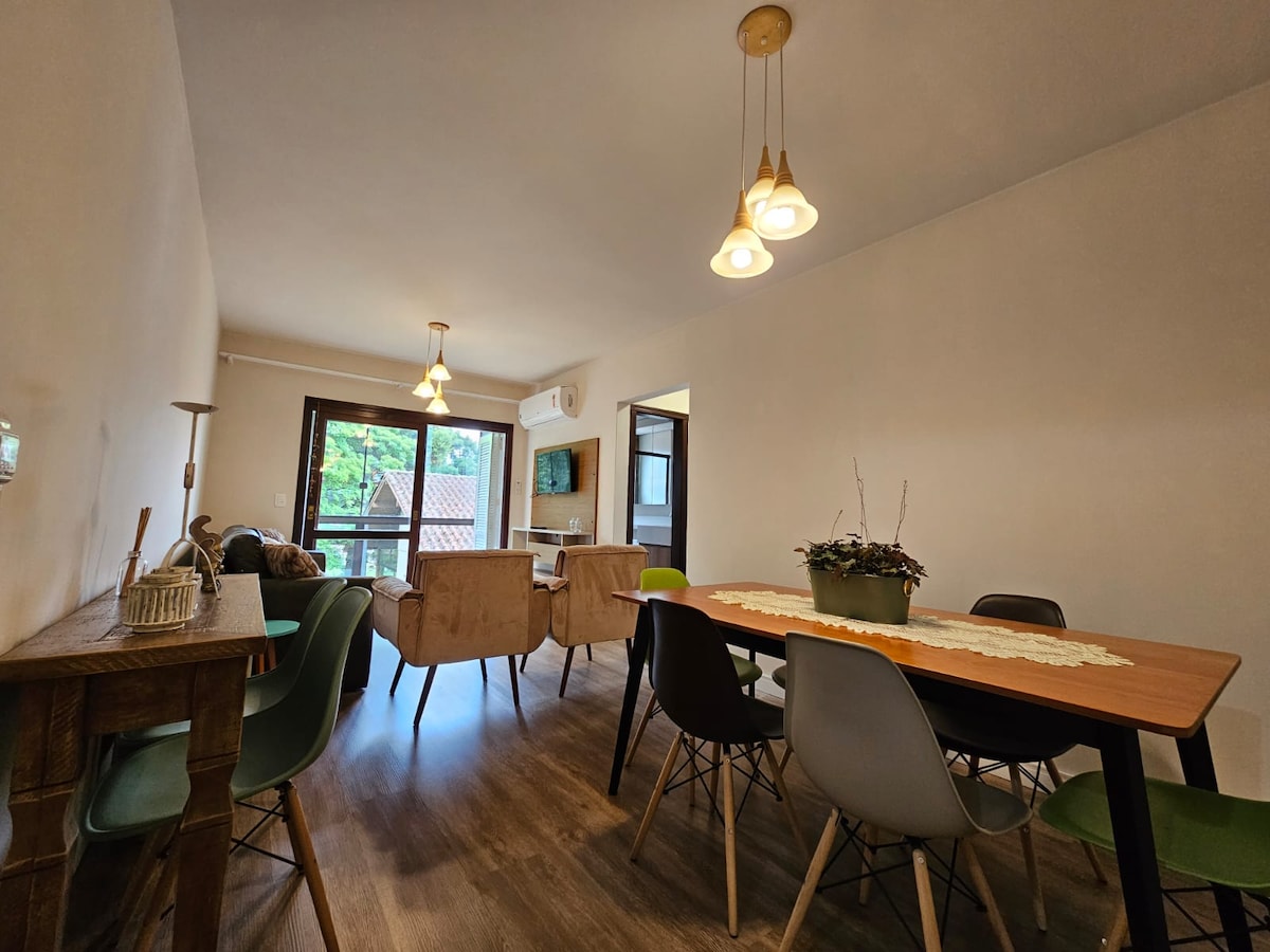 No caminho do Lago Negro! Apartamento todo mobiliado e equipado, com todo o charme de Gramado. Localizado em rua tranquila e arborizada, lhe permitindo acordar com o canto dos passarinhos e lhe proporcionando uma caminhada inspiradora até o Lago Negro. Apartamento de frente para a rua, excelente para casais ou casais com 2 filhos. Ambiente agradável e o melhor de tudo um orçamento que cabe no seu bolço. Não perca mais tempo, venha se hospedar nesse encanto.