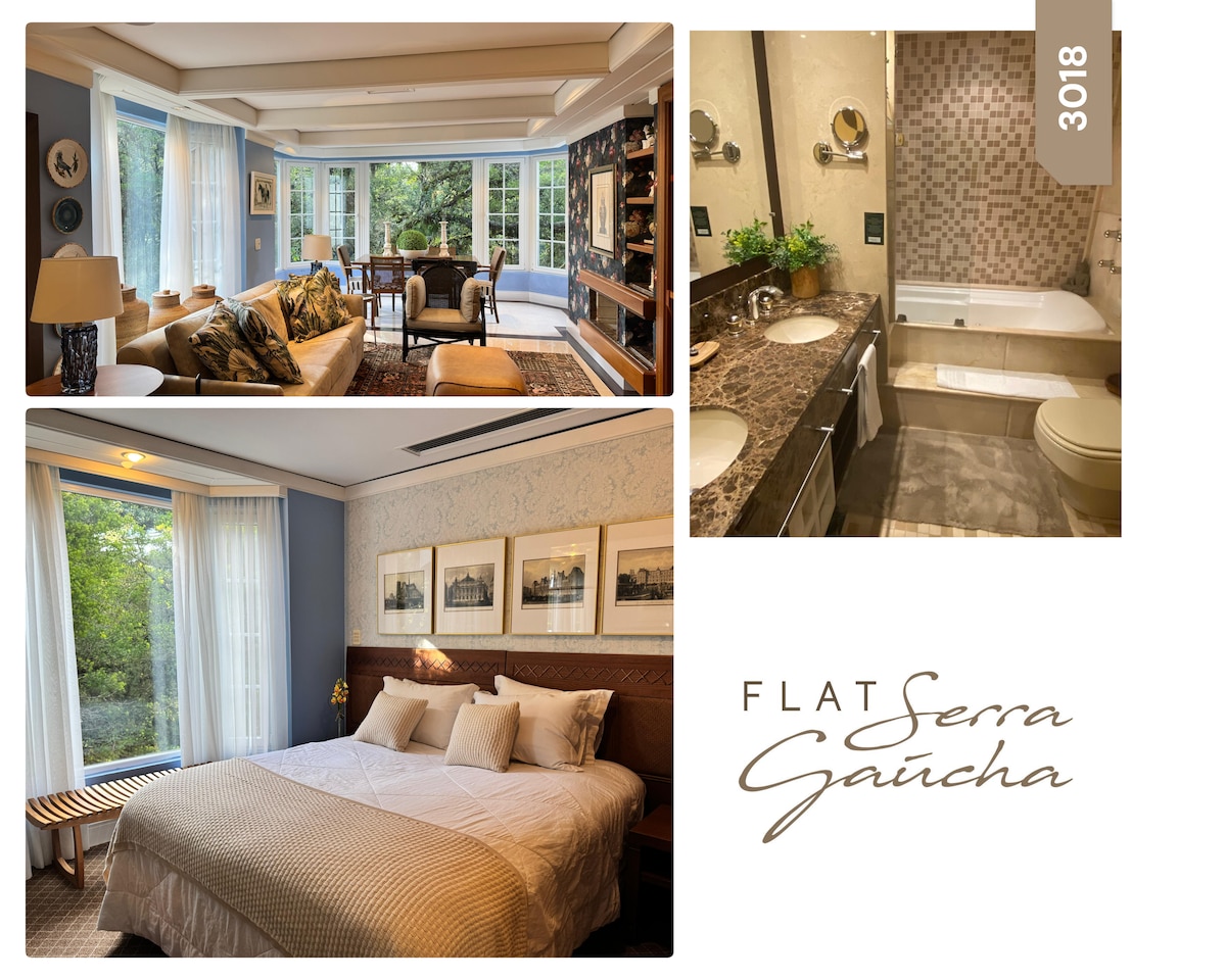 ✨ Flat/Suíte de Alto Padrão no Laje de Pedra – Canela/RS Aconchegante flat para até 5 pessoas, com quarto de casal, sala ampla com dois ambientes, lareira, sofá-cama, recamier e mesa de jantar. Cozinha completa. Banheiro com duas cubas e banheira de hidromassagem. 🌲 Localizado no Mountain Village, dentro do icônico Condomínio Laje de Pedra, com linda vista para um bosque de araucárias. Um refúgio de conforto, charme e natureza na Serra Gaúcha.
