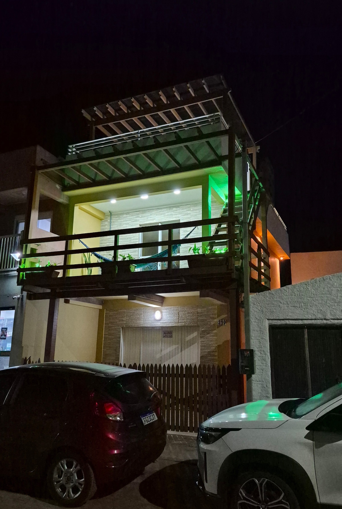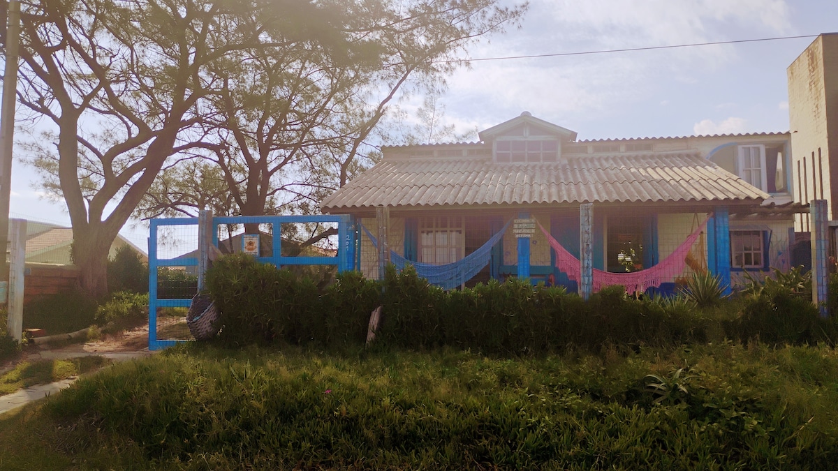 Casa pé na areia com deck privativo com escada a beira mar, sacada ampla inferior e superior, deck com bancos, espreguicadeiras e rede. Forno e fogão a lenha, além de churrasqueira tipo parrijeira e lareira. Cozinha completa. Peças amplas e arejadas. Colchões com capas higienizáveis. Um paraíso para festejar com amigos e familia. Tem pranchas, morey e bicicleta. A noite do deck superior se pode ver a iluminação do farol do Chuí, que divide Brasil e Uruguai.