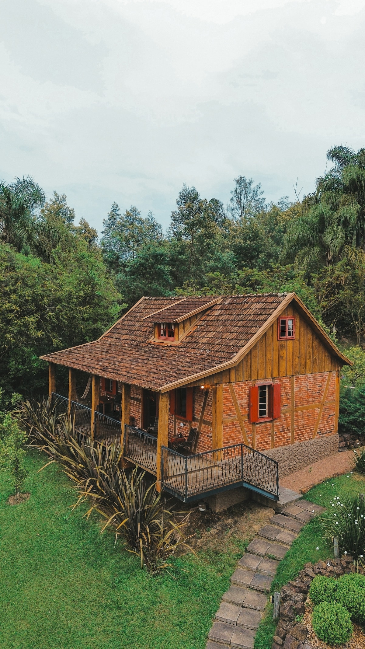 O CHALÉ VERMELHO é um dos seis chalés da Vila Entre Montanhas, localizada no centro da charmosa Picada Café (Serra Gaúcha), a 1h15min de Porto Alegre. São 100m² que acomodam até 05 pessoas em 01 cama king, 01 cama queen e 01 sofá-cama. Além da vista para as montanhas, conta com hidromassagem com cromoterapia e sais/espuma de banho, calefator a lenha, Smart TV, wi-fi, ar-condicionado, varanda para curtir o nascer do sol/estrelas, rede, parrilla e lareira ecológica.