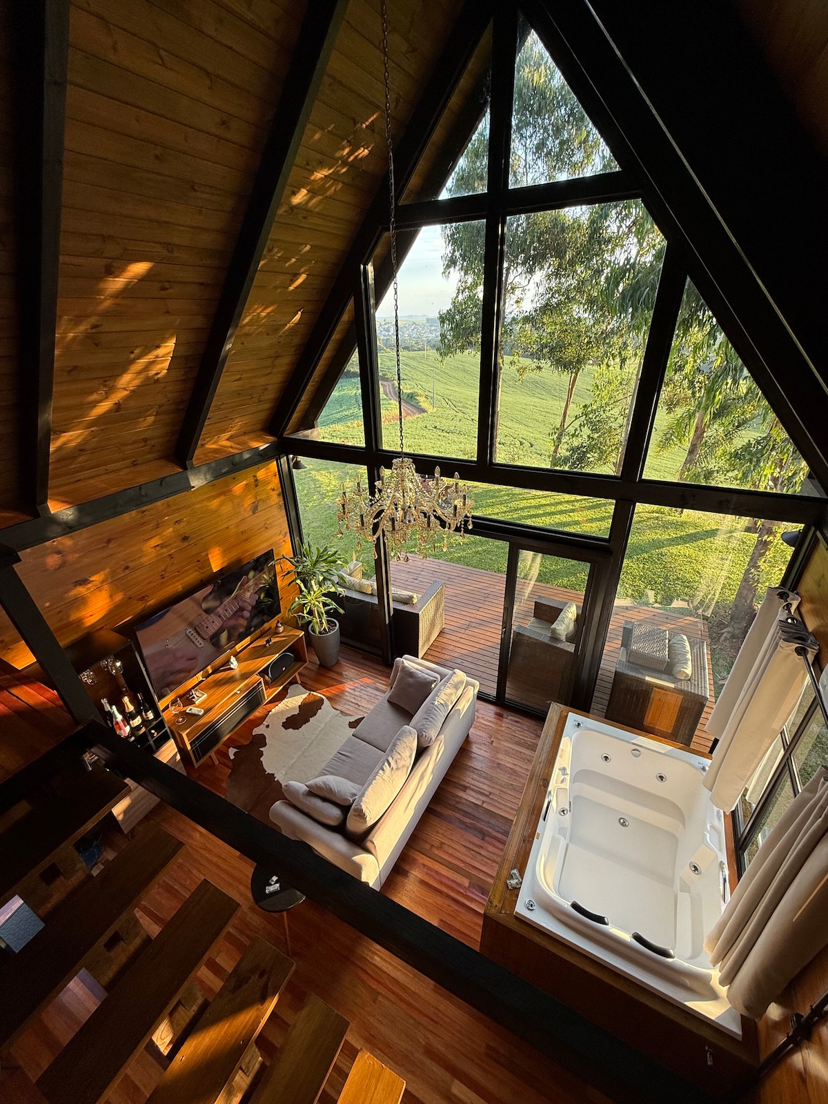 Uma cabana A frame imersa na mata nativa e nos parreirais de uma família de origem italiana. Projetada para acordar com o som dos pássaros e dormir com o barulho da água. O ponto alto fica logo na chegada, o deck fica em cima de uma cachoeira. A cozinha é completa com utensílios de ótima qualidade. O banheiro tem vista para a mata, banheira de imersão e amenities L'Occitane. Todos os cômodos são decorados nos mínimos detalhes. Ideal para relaxar e se colocar no compasso certo da vida.