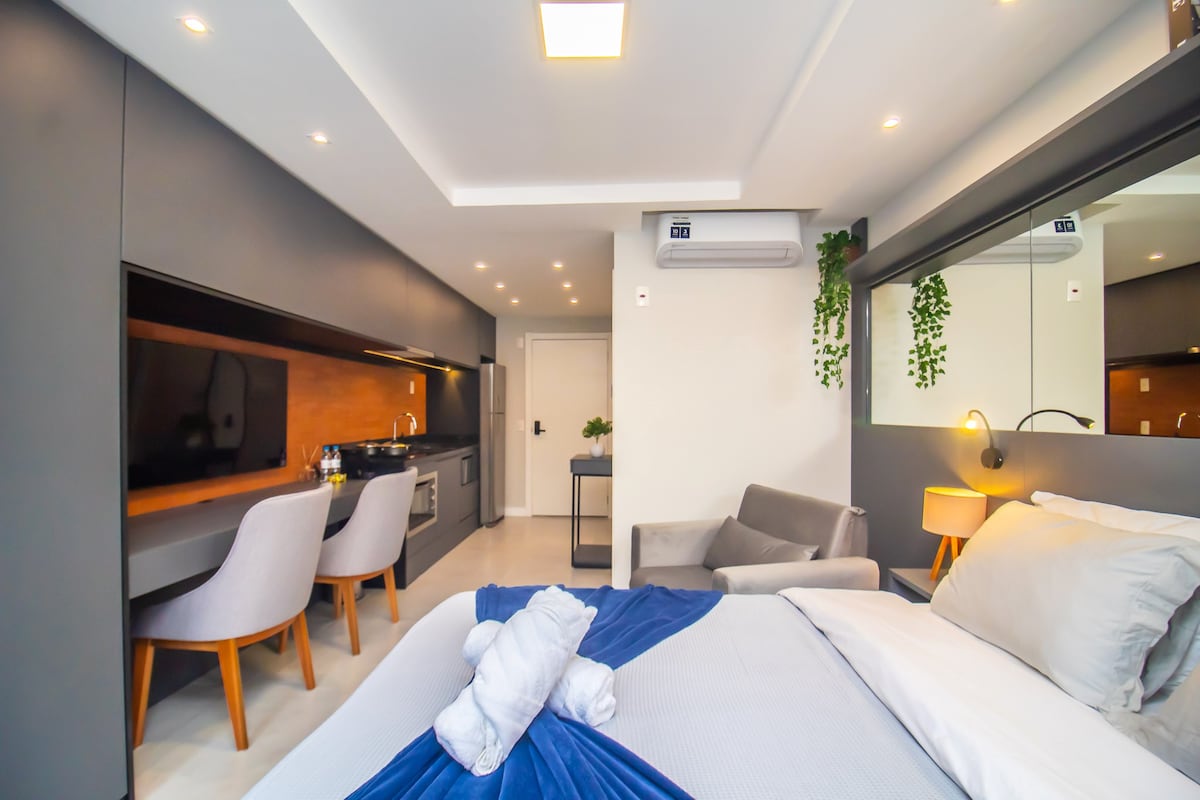 Viva uma experiência única neste estúdio acolhedor e elegante, projetado com atenção aos detalhes para oferecer conforto, funcionalidade e muito estilo. O ap azul planejado é um diferencial exclusivo, com iluminação suave e decoração pensada para relaxar, móvel inteligente e versátil que se transforma em mesa de jantar ou apoio para cozinhar — perfeito para quem valoriza funcionalidade. Piano digital disponível para relaxar, praticar ou se inspirar. Smart TV, Wi-Fi.