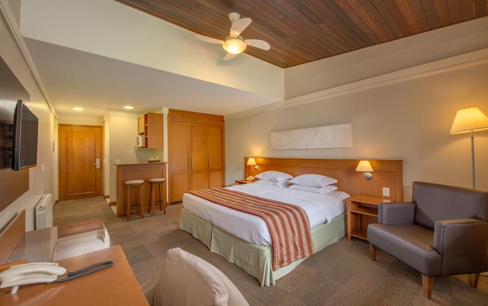Flat Luxo no Mountain Village para até 4 pessoas. Quarto luxuoso com vista para o bosque, decoração clássica com cama Queen, sala com 2 sofás-cama e cozinha tipo americana, ambientes com ar condicionado quente e frio, piso aquecido, lareira, TV LCD com TV a cabo, internet e mini cozinha americana com microondas, geladeira e máquina de lavar louça. Banheiro com pia em granito, duas cubas e banheira de hidromassagem. Voltagem do flat toda 220V.