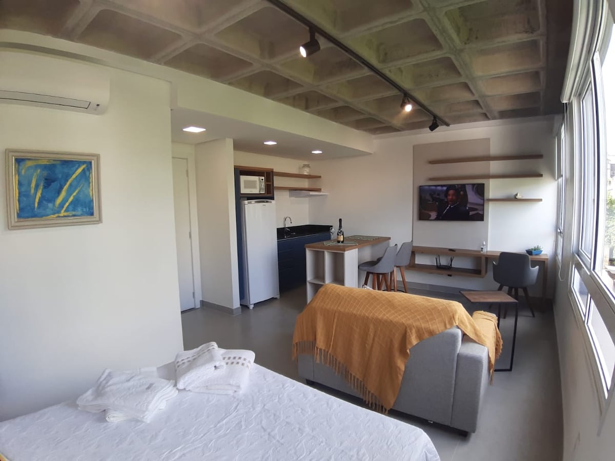 Curta uma experiência singular neste espaço bem-localizado. - AR-Condicionado - Lava e Seca - Enxovais de cama e banho - Colchão pillow top c/massageador - Forno elétrico - Microondas - Purificador de água - Wi-Fi 400mb - TV 55' smart c/ firetv - canto work - Sofá-cama Melhor localização de Caxias do Sul, frente ao Pátio da Estação . Próx. a vida noturna caxiense, boates, bares, restaurantes, faculdades, shopping Bourbon e feiras ecológicas. Box de garagem. Prédio monitorado por câmeras.