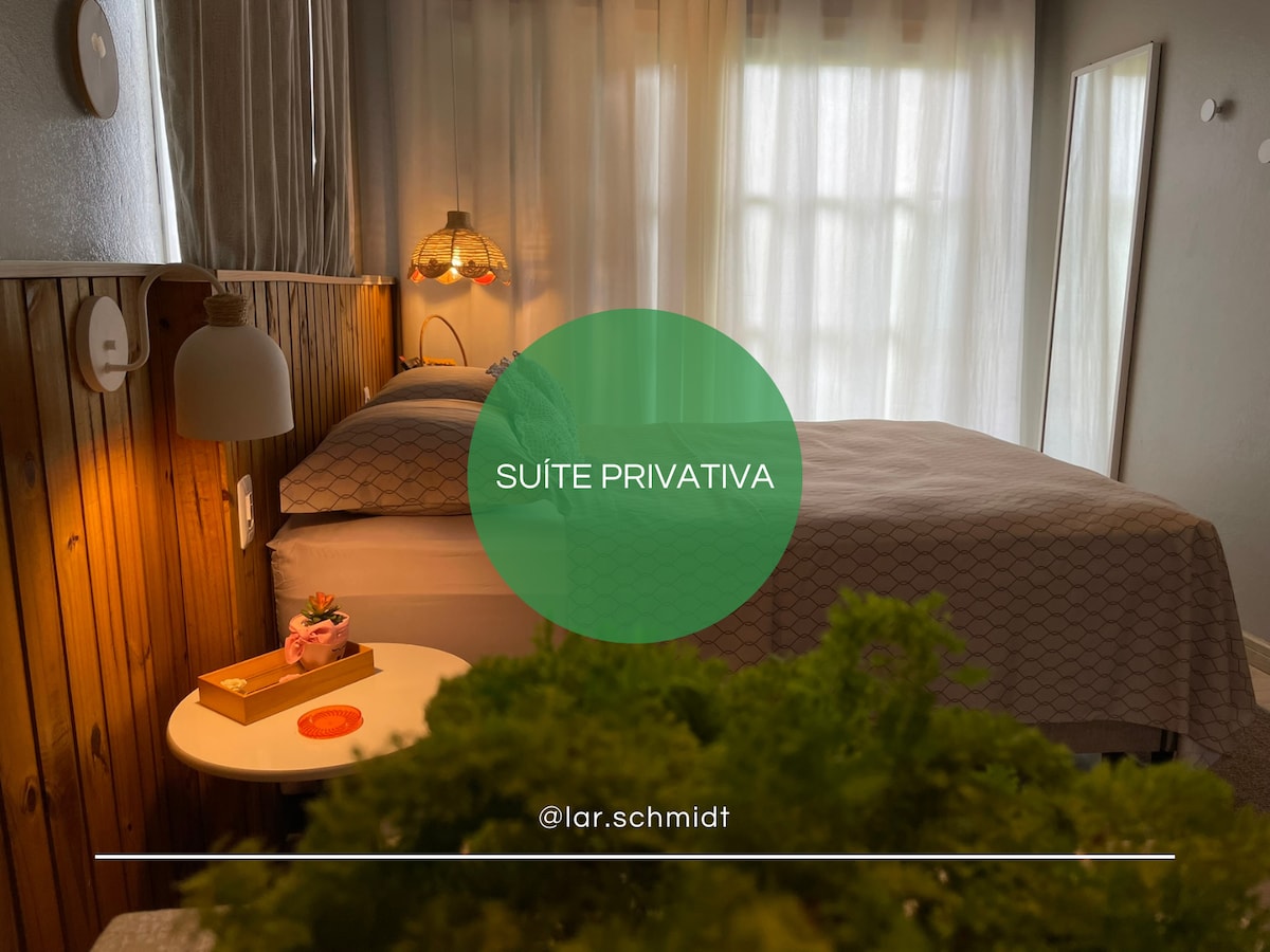 Se você deseja descansar nas férias e acordar com o canto dos pássaros, seja bem-vindo(a) ao Lar Schmidt! Disponho de uma suíte extremamente aconchegante, ideal para casal ou até 3 pessoas. Peço, apenas, que traga sua toalha de banho, o restante deixa comigo!