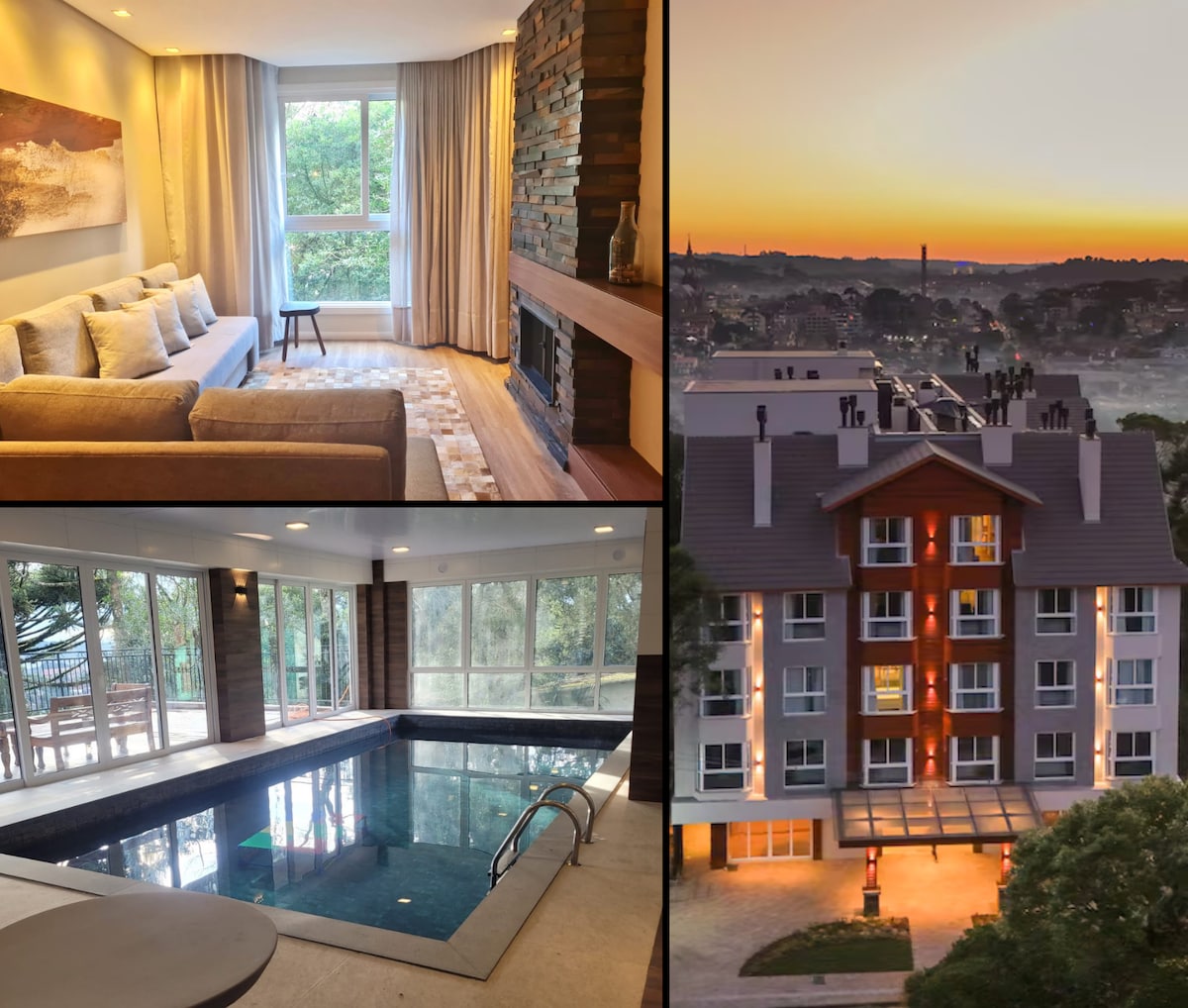 🍁Divirta-se na Serra Gaúcha e hospede-se neste flat sofisticado em Canela com vista espetacular da Catedral de Pedra. Cozinha equipada, lareira aconchegante e quarto iluminado naturalmente. Acomoda até 4 pessoas + 1 criança (até 2 anos). Wi-Fi, Smart TV e ar-condicionado. Prédio com piscina aquecida, sauna, playground e academia. A apenas 5 min de restaurantes, cafés e atrações. Perfeito para casais e famílias que buscam conforto e charme 🍂