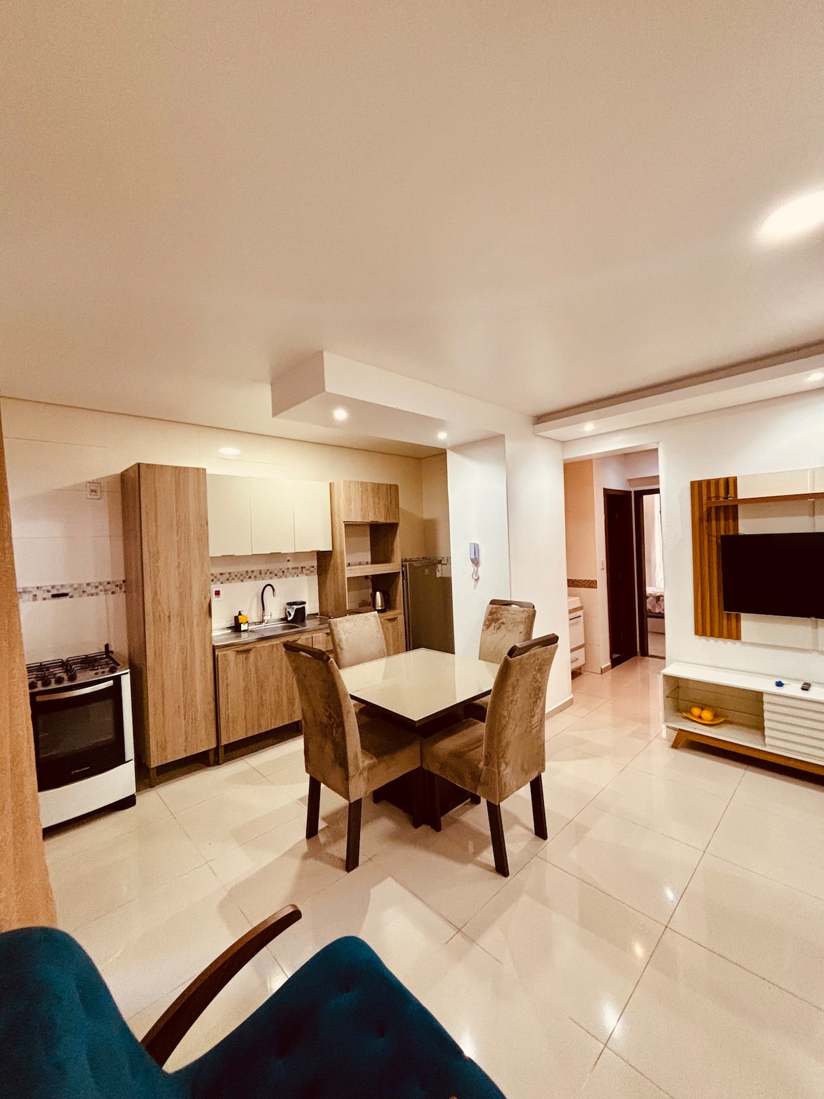Apartamento completo com dois ar condicionado novinho e na lavanderia do apartamento uma máquina de lavar e secar, na sala de estar tv de 50 polegadas e na suite tem secador de cabelo, na cozinha jarra elétrica, fritadeira sem óleo forno grande embutido panela de pressão e sugador em cima do fogão, todos os utensílios de cozinha, prá se vc preferir fazer a sua refeição, conseguir fazer sem problemas... Internet WI-FI com senha.