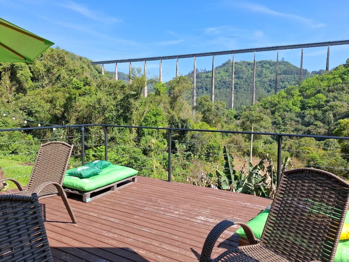 Hospede-se aos pés do segundo maior viaduto do mundo e o maior da América Latina! O incrível V13, ícone da Ferrovia do Trigo, é uma experiência memorável. As cabanas coloridas contam com banheiro externo, compartilhado entre quatro unidades. Você encontrará churrasqueiras, além de acesso gratuito à cascata, por escadas. No local também há um restaurante e um deck mirante com uma vista privilegiada do monumental V13, perfeito para lindas fotos e contemplação! Lembre-se de trazer suas toalhas!