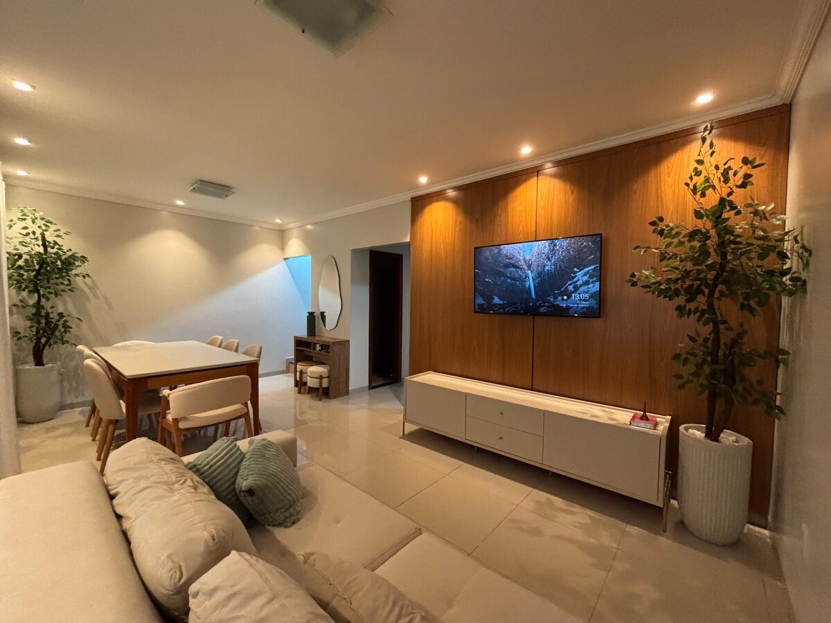 Apartamento mobiliado com 2 quartos, banheiro, cozinha americana e sala integrada. Acomoda até 5 pessoas com conforto: 2 camas de casal, colchão de solteiro, sofá, TV, geladeira, air fryer, fogão, máquina de lavar, 2 guarda-roupas, mesa e cadeiras. Pronto para sua estadia, com praticidade e funcionalidade em cada detalhe!