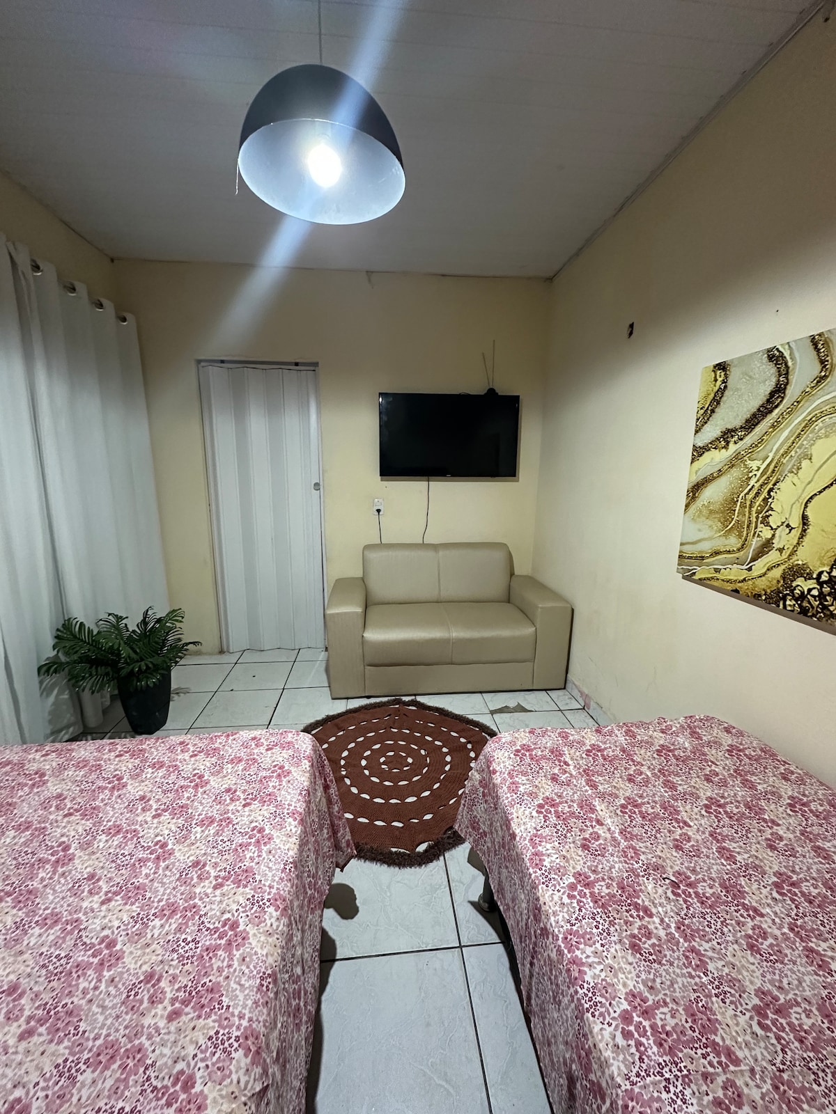 Esta linda acomodação fica em uma região centralizada de Boa Vista próximo a pizzarias , mercados , e farmácias . A suíte independente é super aconchegante, e oferece conforto. É uma ótima opção para quem busca tranquilidade…e flexibilidade… Super privativa no segundo andar , acesso pela escada caracol na lateral. onde possui uma sacada individual com vista privilegiada , Ambiente familiar, estadia tranquila e segura, tem espaço para um carro , porém não é coberta. Ótimo custo benefício.