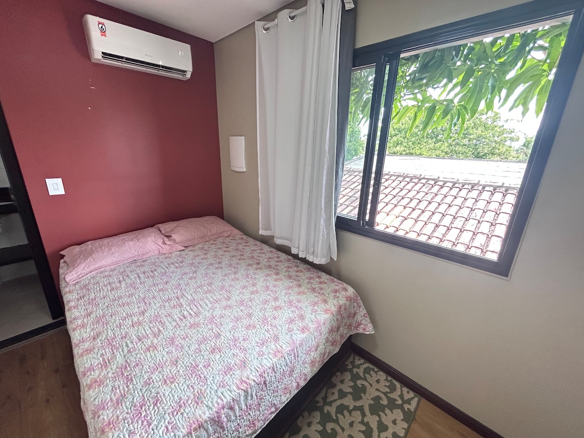 Apartamento localizado em um ambiente tranquilo e reservado, com sombra natural de uma mangueira que deixa o espaço mais fresco e agradável. Conta com cama confortável, ar-condicionado, banheiro privativo e acesso à piscina e à cozinha externa. Ideal para quem busca descanso, praticidade e uma estadia sem complicações em Boa Vista.