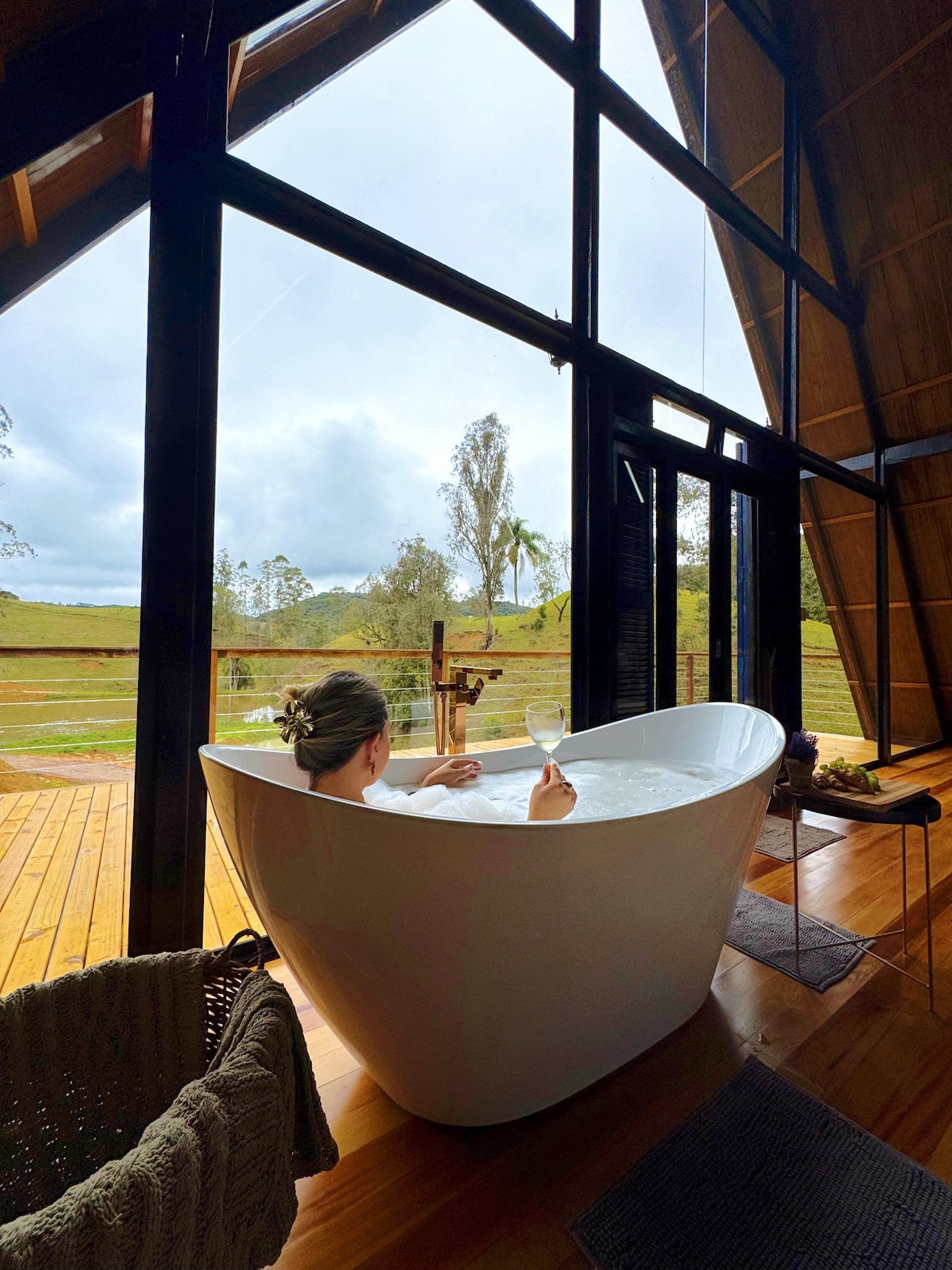 Uma cabana A frame imersa na mata nativa e nos parreirais de uma família de origem italiana. Projetada para acordar com o som dos pássaros e dormir com o barulho da água. O ponto alto fica logo na chegada, o deck fica em cima de uma cachoeira. A cozinha é completa com utensílios de ótima qualidade. O banheiro tem vista para a mata, banheira de imersão e amenities L'Occitane. Todos os cômodos são decorados nos mínimos detalhes. Ideal para relaxar e se colocar no compasso certo da vida.