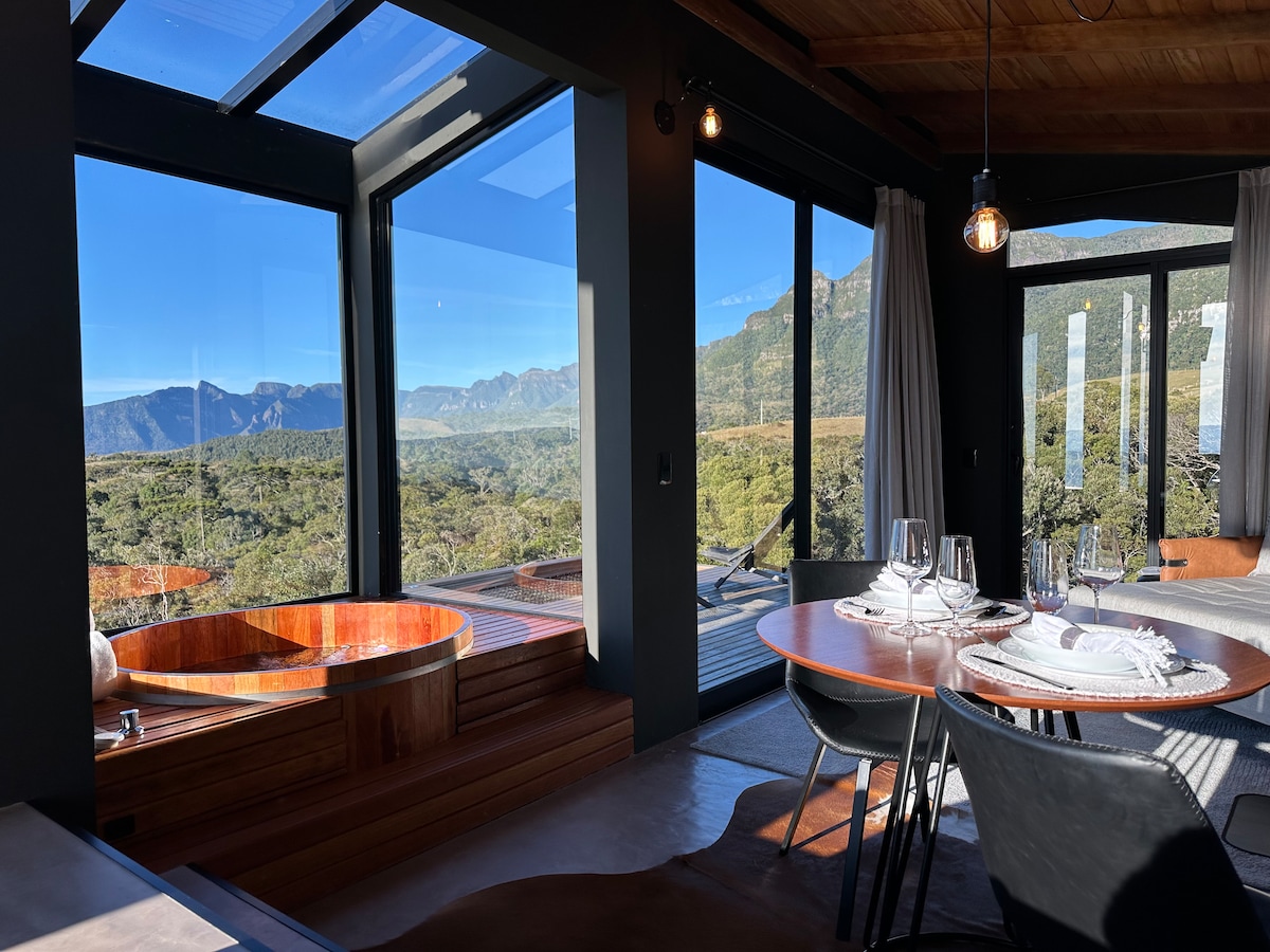 Sunrise Home - Meio do Nada Cabanas na Montanha É o tipo de lugar que não se explica, se sente. A 1037m de altitude, a cabana entrega uma vista 360° que hipnotiza e um silêncio que reseta a mente. O dia começa acima das nuvens, espetáculo particular só pra quem está aqui. O ofurô de madeira de 1000L, aquecido e com hidro, transforma a estadia em algo único. À noite, a lareira aquece o corpo, enquanto o céu estrelado rouba a cena. Sem vizinhos, sem pressa, sem filtros. Puro, raro, inesquecível.