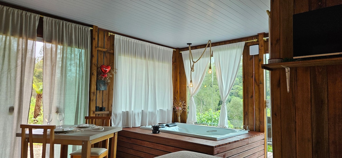 Desconecte-se da rotina em uma experiência única neste chalé aconchegante cercado pela natureza. Ideal para famílias, casais ou grupos de amigos, o espaço acomoda confortavelmente até 6 pessoas e oferece todo o conforto necessário para momentos de descanso e conexão. A banheira de hidromassagem é perfeita para relaxar curtindo o visual da mata. O chalé conta com ambientes amplos, incluindo cozinha completa, sala com lareira, varanda com vista para a paisagem e quartos confortáveis.