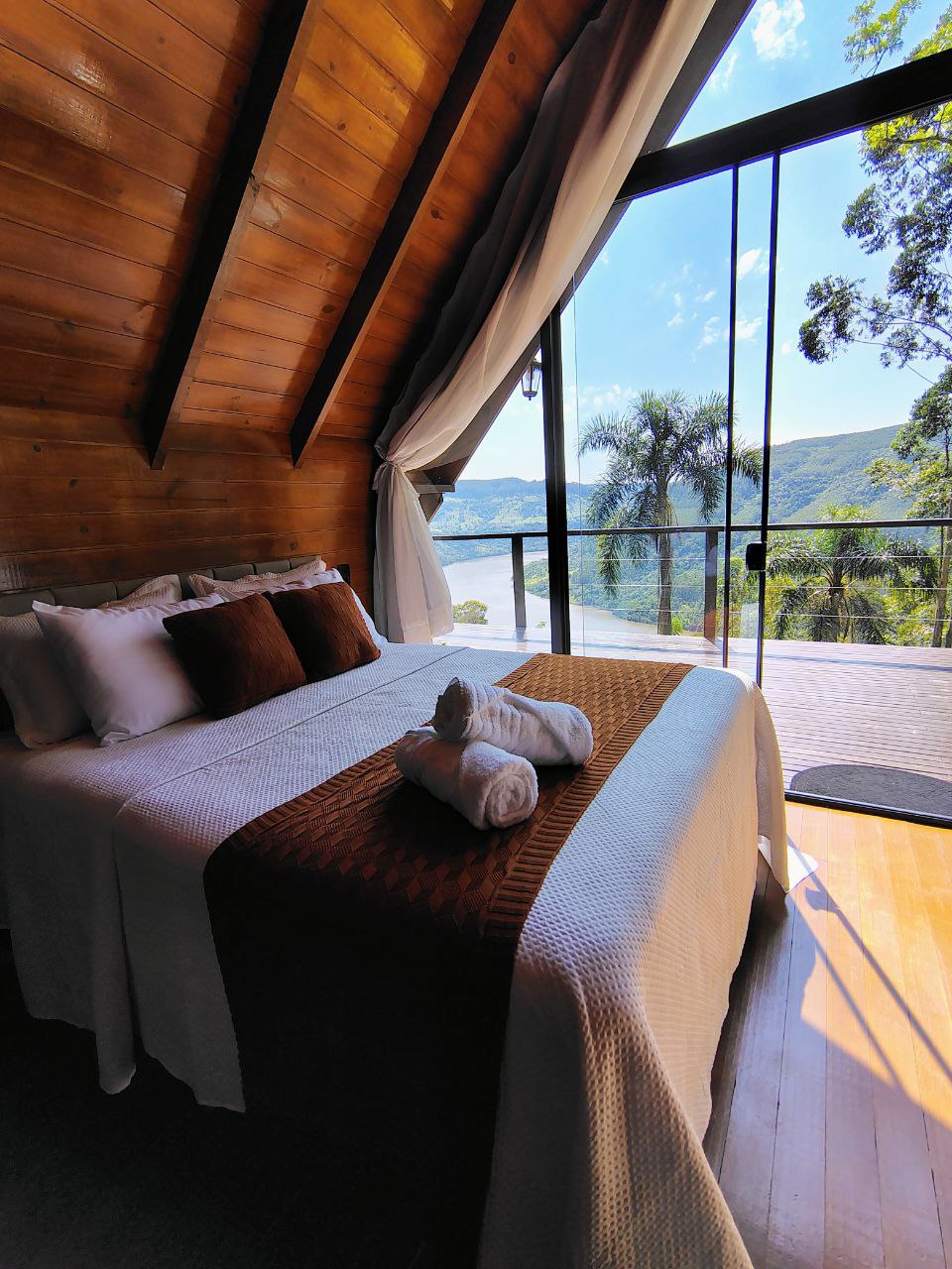 Uma cabana A frame imersa na mata nativa e nos parreirais de uma família de origem italiana. Projetada para acordar com o som dos pássaros e dormir com o barulho da água. O ponto alto fica logo na chegada, o deck fica em cima de uma cachoeira. A cozinha é completa com utensílios de ótima qualidade. O banheiro tem vista para a mata, banheira de imersão e amenities L'Occitane. Todos os cômodos são decorados nos mínimos detalhes. Ideal para relaxar e se colocar no compasso certo da vida.