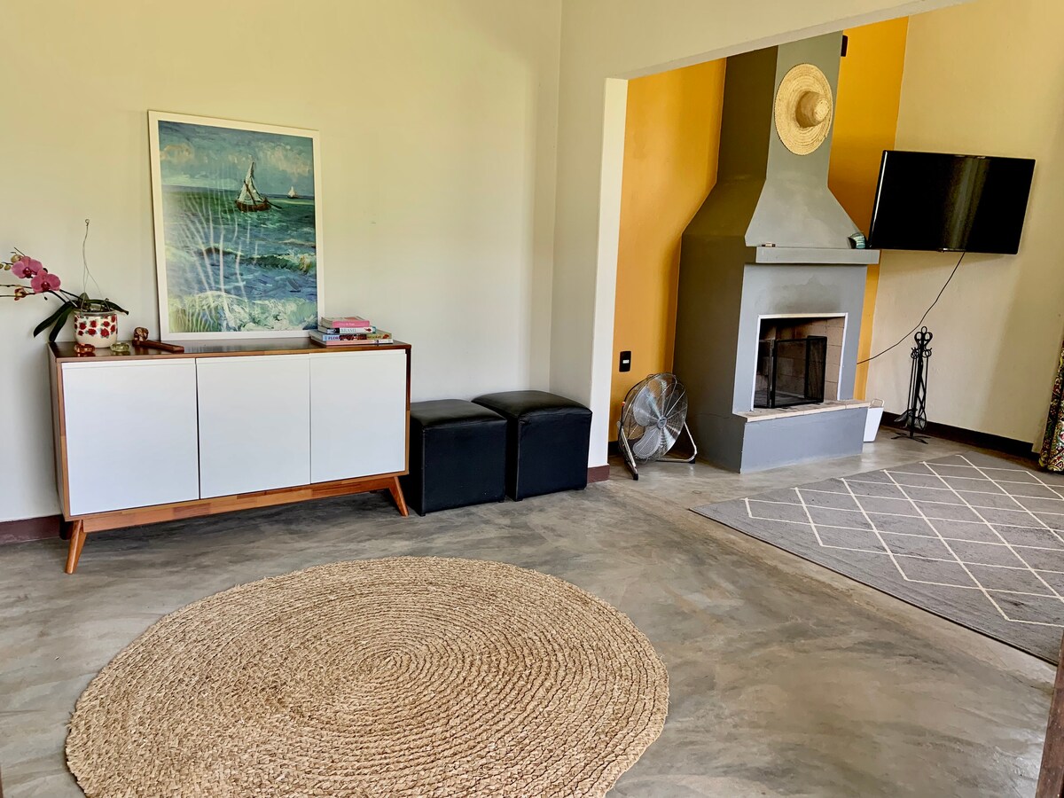 A casa é toda cercada com tela, entrada privativa. No mezanino tem sacada com vista para o campo, ar condicionado Q/F, banheiro (suíte) e uma confortável cama king size. No térreo tem um banheiro social, sala aconchegante com ar condicionado Q/F, móveis antigos mesa para refeições e uma linda lareira. A cozinha é ampla e completa. Na propriedade produzimos pitayas, não deixe de aproveitar as frutas e seus derivados. Para comer oferecemos algumas opções de pratos , peça o cardápio.