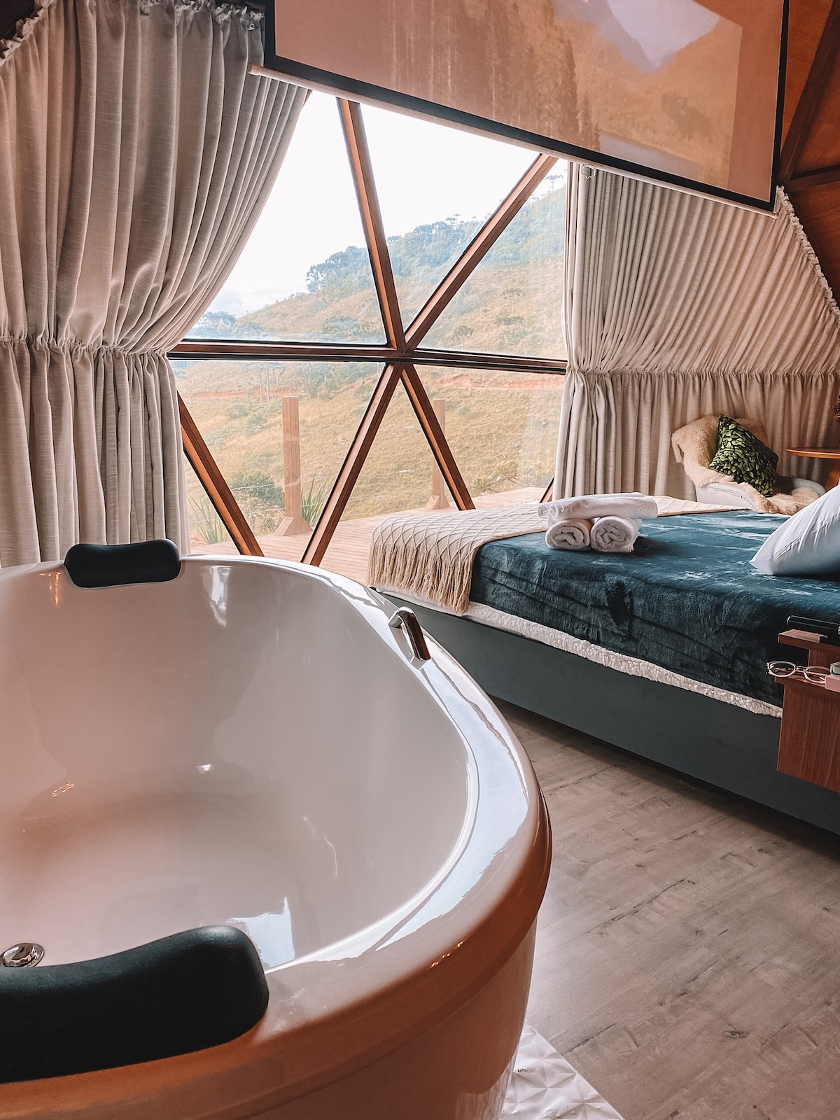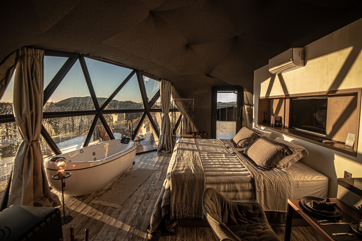 Piscina infinita aquecida, banheira com vista 180° dos cânions e privacidade absoluta para dois. Viva um filme de amor na “Capadócia Brasileira” Imagine chegar a uma cúpula geodésica de luxo, cercada por montanhas e pelo som de uma cachoeira. Ao abrir a porta, você encontra um espaço climatizado, iluminado por luz natural e pronto para viver um filme romântico – com todo o conforto de um hotel-boutique e a liberdade de um refúgio na natureza.