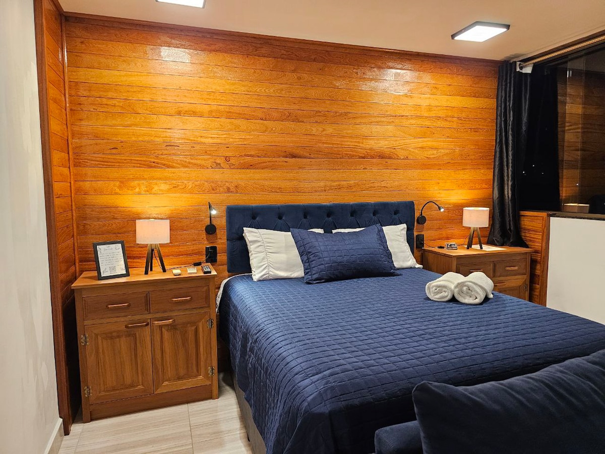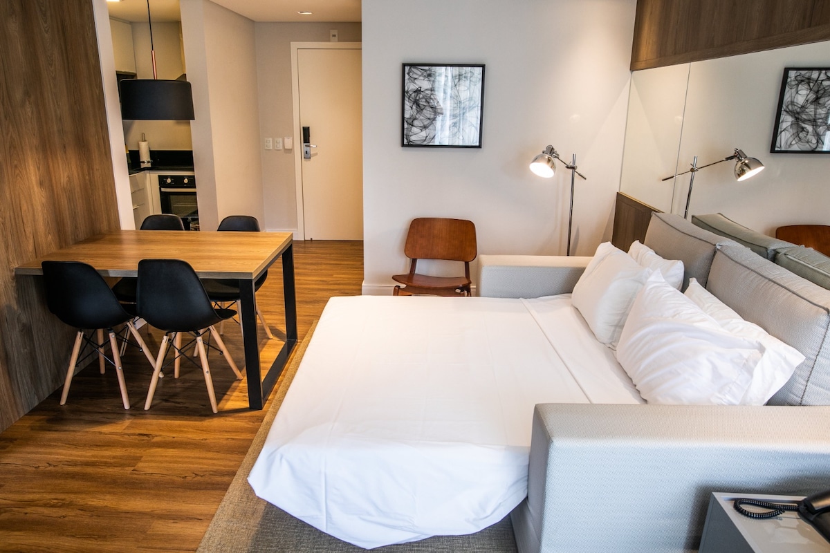 Você vai adorar a decoração estilosa deste charmoso lugar para ficar. Studio com enxoval macio, ar split, TV smart, frigobar, microondas, pia e wifi gratuito. Com 1 cama de casal ou 2 de solteiro. Recepção 24 horas, Piscina, Máquina de Bebidas e Snacks. As políticas de pagamento são direto com a plataforma do AIRBNB. Check-in é 24 horas, direto na recepção, com documento de identificação. Nas diárias, não INCLUI CAFÉ DA MANHÃ E ESTACIONAMENTO. CHECK-IN AS 15 H E CHECK-OUT 11 HORAS.