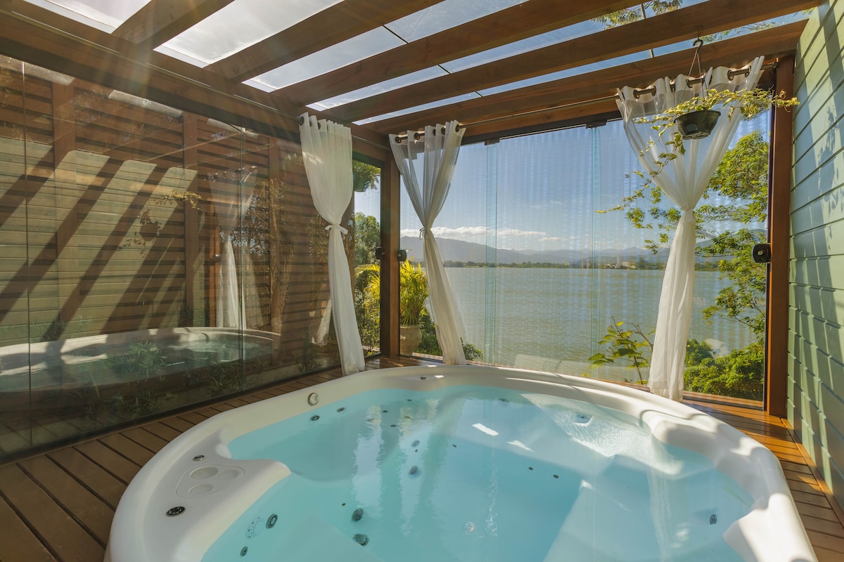 Desfrute do refúgio EXCLUSIVO E PRIVATIVO com ofurô AQUECIDO, em meio à um bosque com VISUAL espetacular do pôr-do-sol na Lagoa Encantada . As suítes possuem ar condicionado, TV e Wi-fi 600MB Ofurô aquecido e com hidromassagem. Quiosque Espaço Gourmet completo. São duas suítes, uma com uma cama de casal e a outra com duas camas de casal, não alugamos separadamente . Próximo da praia e do centrinho. Acesso à Praia por trilha ou escadaria exclusiva, um belo exercício para o corpo e alma.