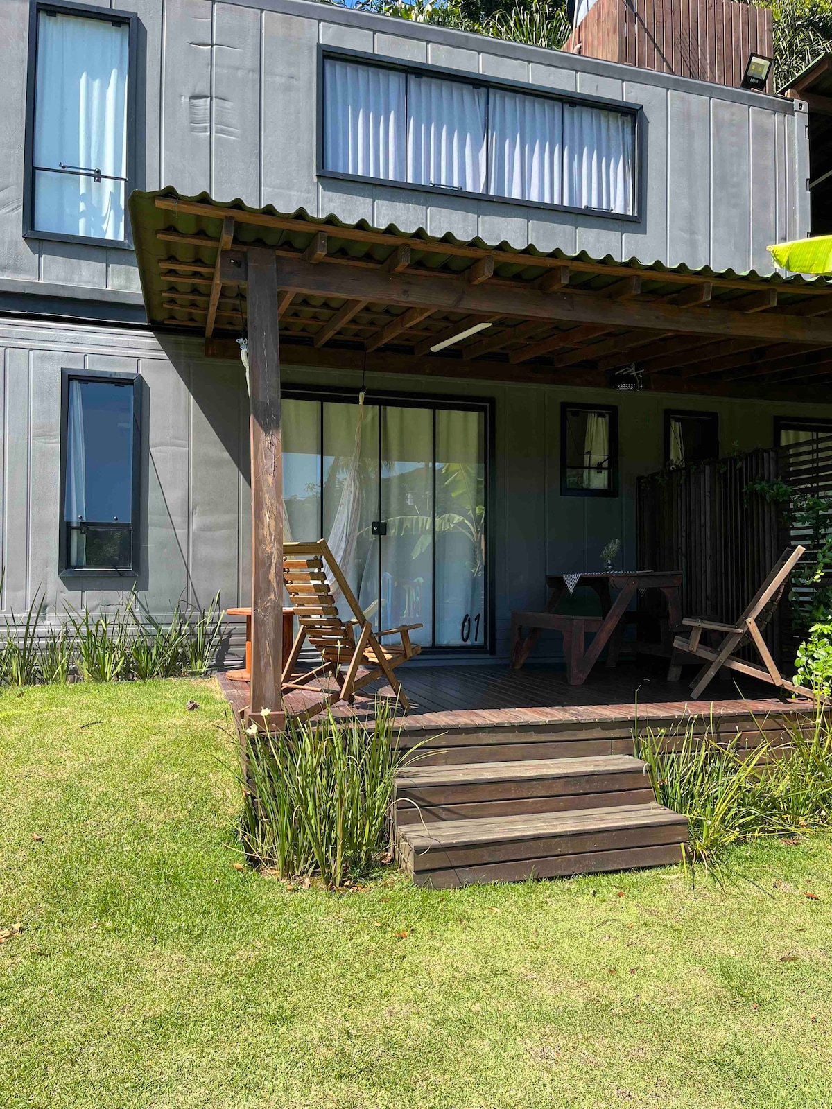 Studio em um Container, com projeto moderno, prático e harmonioso, todo sob medida, acomoda até 03 hóspedes + 01 Pet FESTAS FIM DE ANO -verifique minino diárias São 15m2 internos + 12m2 varanda. Cozinha completa, banheiro e deck coberto privativo, Smart TV, Wi-Fi Gratuito, Ar Condicionado Split, tudo para oferecer qualidade, conforto e aconchego. Espaço único privilegiado em meio a natureza preservada onde o canto dos pássaros será a trilha sonora de suas férias. Estamos a 05 min a pé da praia