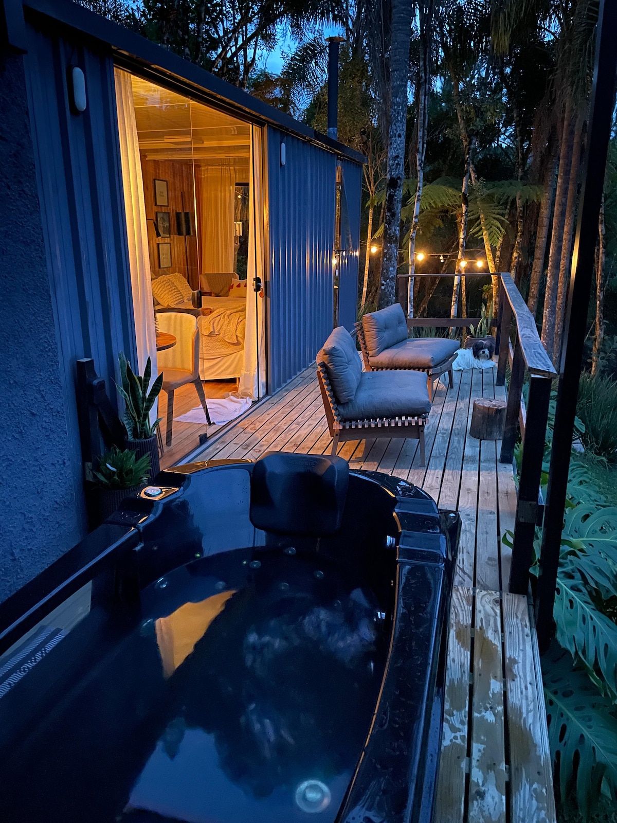 Estúdio compacto para casal em casa container. Sala, cozinha e quarto integrados, com banheiro privativo. Estilo moderno e aventureiro, para casais que buscam vivências e não luxo. Não falta água durante todo o ano. Localizado a 1,2 km da praia de Zimbros. Possui ar condicionado quente e frio. Jacuzzi aquecida a disposição dos hóspedes.