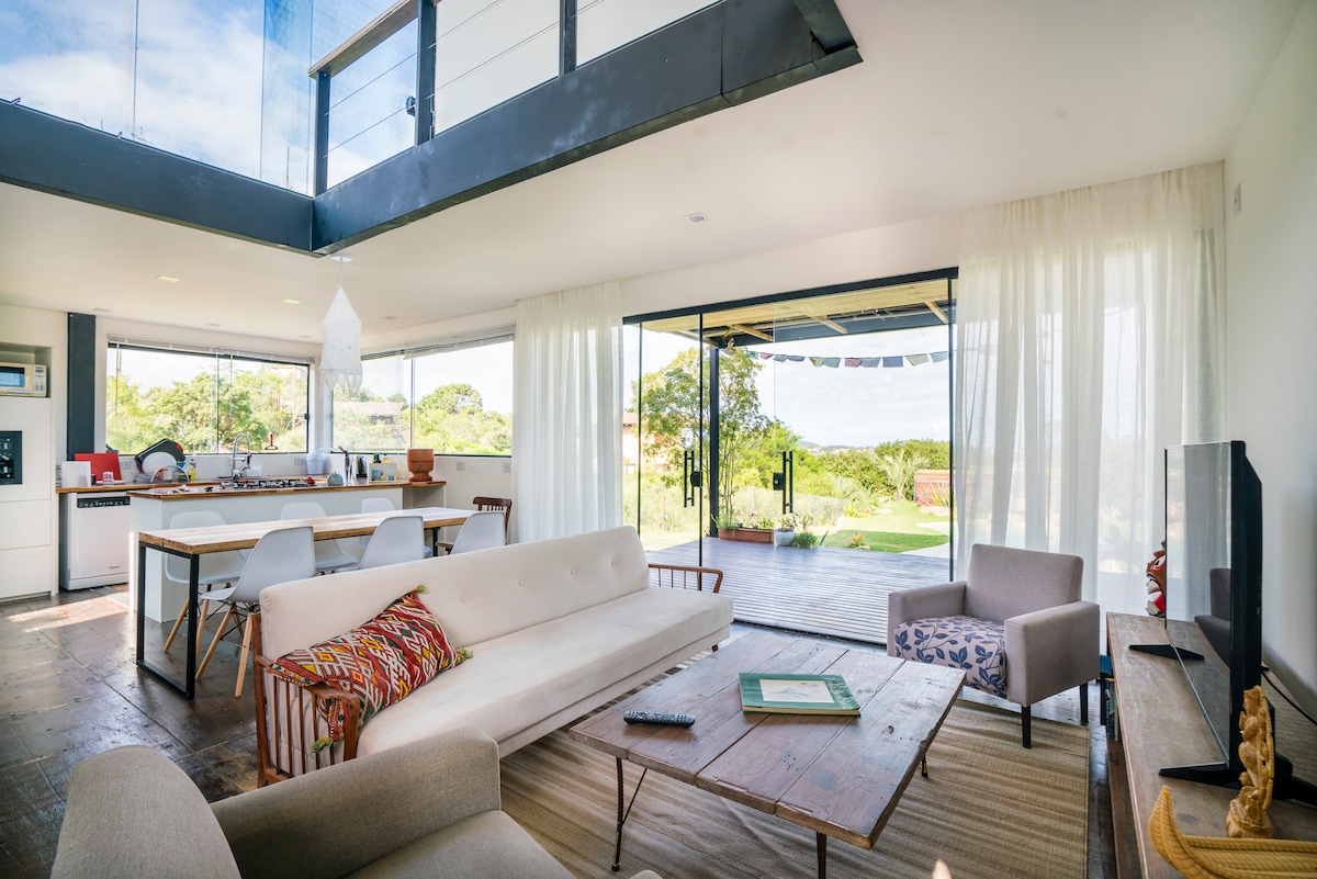 Nossa casa segue um conceito inovador unindo conforto, sustentabilidade e natureza. Ideal para casais, pet friendly. Está localizada em um lugar privilegiado de frente para o mar e cercado de mata nativa, em um terreno amplo e cercado. Nosso espaço dispõe de ar-condicionado, aquecedor, internet wi-fi 5G 200mb, cozinha completa, churrasqueira, alarme, e tudo o mais que é preciso para desfrutar desse paraíso ouvindo o mar e os pássaros.