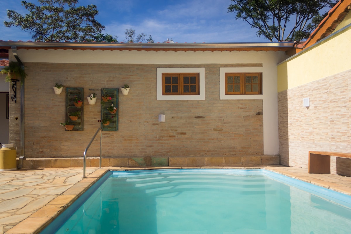 Suíte casal aconchegante com cama Queen Size, Internet de Alta Velocidade, TV smart com sistema SKY, ventilador de teto, secador de cabelo e banheiro privativo com ducha elétrica. No centro de Monte Alegre do Sul, tranquilidade, local silencioso, perto de tudo. Aproveite para passear a pé pelo centro histórico, apreciar as fontes de água mineral e a natureza, visitar alambiques, adegas e muito mais. Diária com um delicioso café da manhã já incluso. Perfeito para descansar e curtir a natureza.