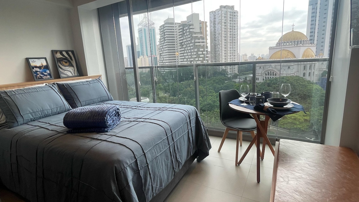 Studio moderno, linda vista ,bem decorado com varanda , cozinha completa, frigobar , enxoval completo . Andar alto . Internet 250 megas, tv smart, ar-condicionado e ducha higiênica . Localização fantástica , próximo aos shoppings JK Iguatemi e Vila Olímpia , Hípica Paulista e às universidades Insper, FMU e Anhembi-Morumbi.1 vaga de garagem. Prédio com academia, solarium , bicicletas à disposição , piscina , lavanderia OMO, espaço coworking, mini mercado autônomo. Consulte valor para 3 hóspedes