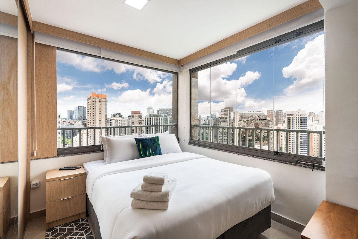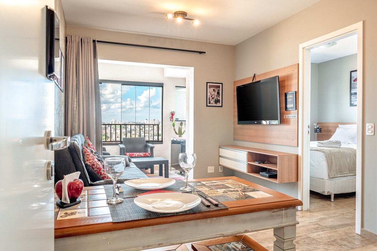 Stylish 50 m² apt. located at Bela Vista, has 24hr doorman. 2 bedrooms (only 1 with AC, and queen bed, the second one is quite small and can be used as an office, fitting a double-sized sofa-bed) and 1 bathroom. With amazing views from every window, it is a great place to work and relax. The private jet-tube at the balcony is a fantastic spot to enjoy the city views. Ideal for couples, professionals or small families looking for comfort, convenience, and one of the best views in the city.
