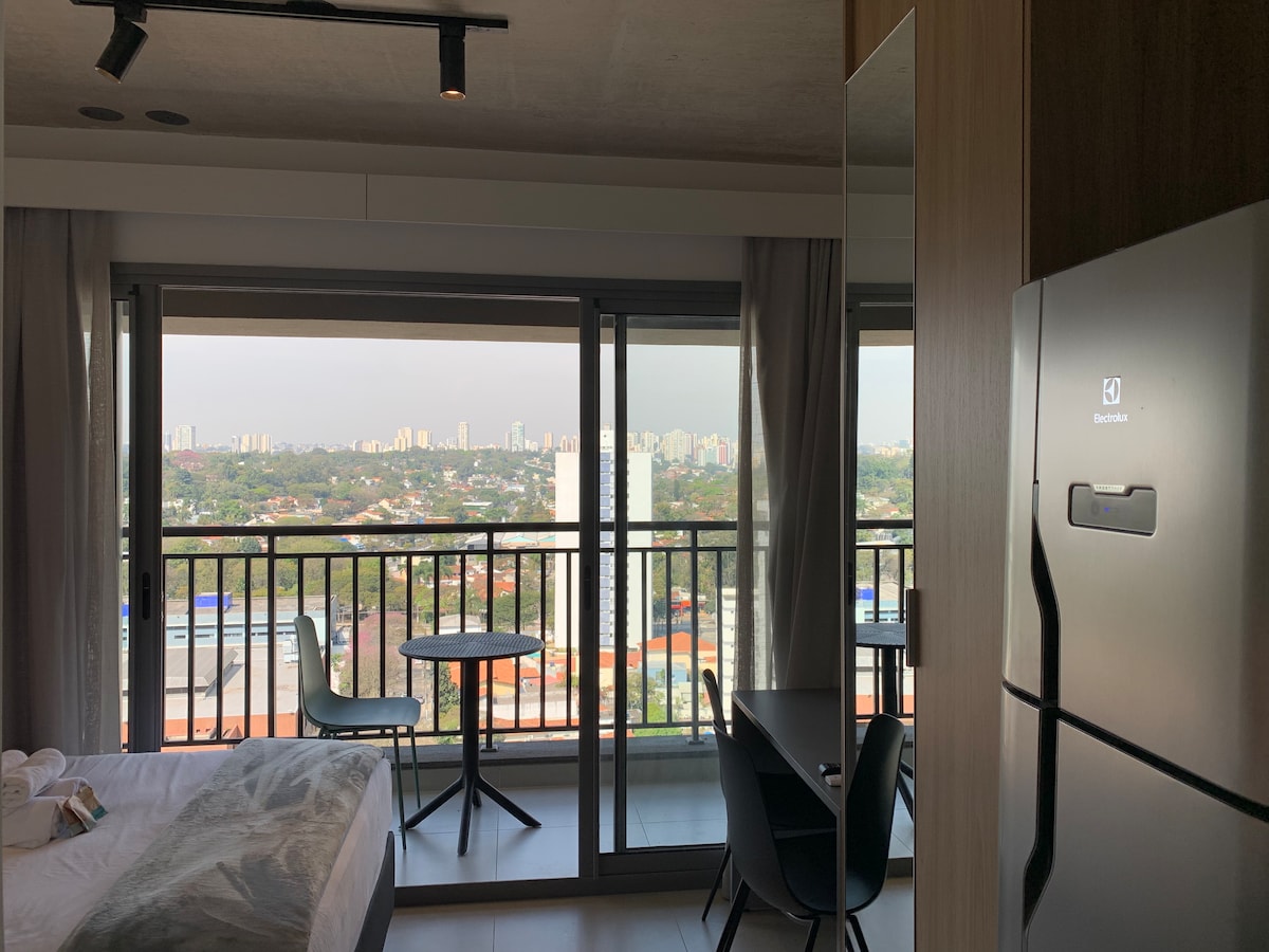 Studio equipado com vista (23m2 - 18º andar). Apto está ao lado da estação Brooklin do metrô, e 12 minutos de carro até o Aeroporto de Congonhas. . >> Locais próximos: . Hípica Paulista . Clínica Einstein . Consulado Americano >> Shopping centers próximos: . Shopping Morumbi . Shopping D&D . Shopping Ibirapuera . Shopping JK Iguatemi >> Você terá no condomínio: . Portaria 24h; . Academia; . Lavanderia OMO; . Coworking