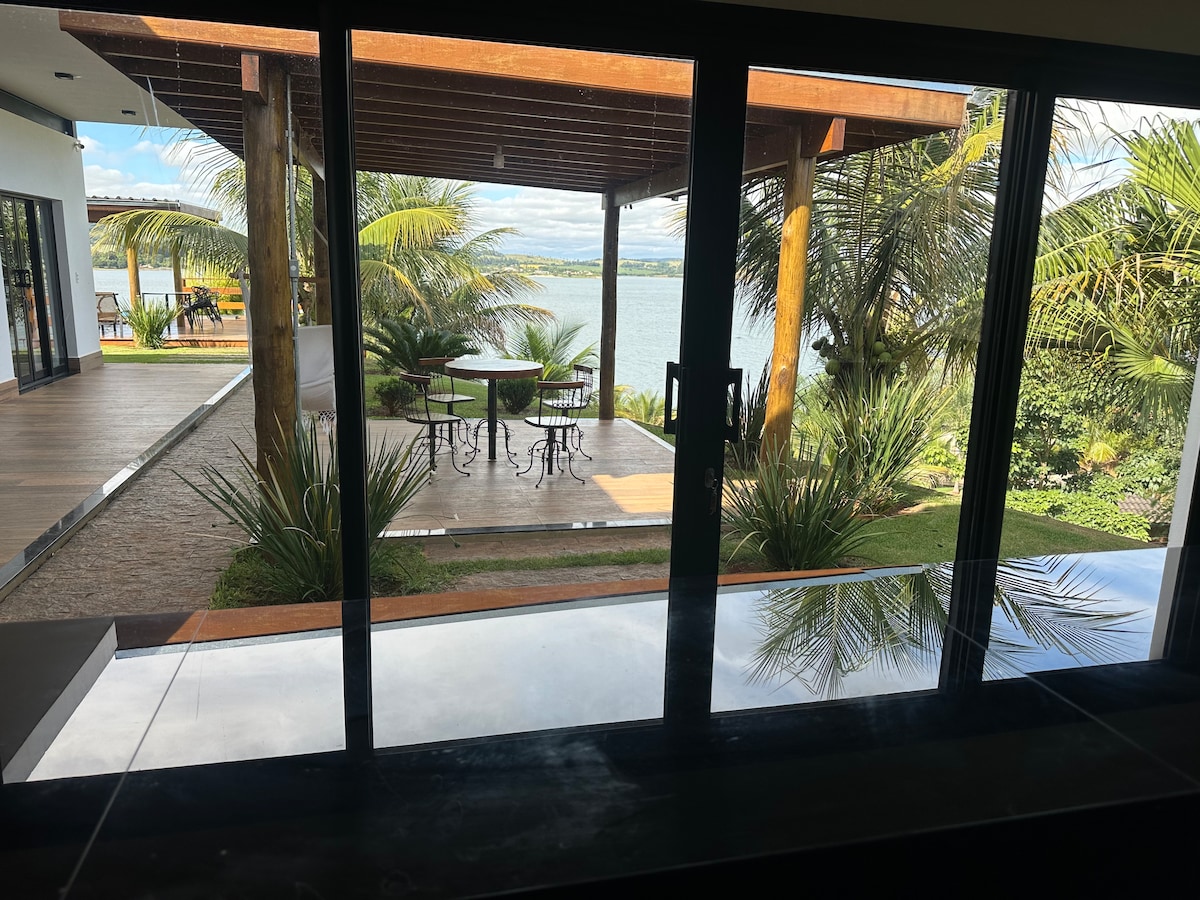 Casa do Lago tem arquitetura contemporânea e é literalmente sobre um lago, numa pequena fazenda na beira da represa. 2 suítes, até banheiros têm vista para o lago, bancada de cozinha com utensílios diferenciados e boa churrasqueira portátil. Quadra de Beach Tennis, prancha de Stand Up, 4 caiaques e 4 bikes. Amplo pier na represa, prainha no lago, redário, local fixo para fogueira, cachoeirinha, trilhas, grande reflorestamento, pasto com gado leiteiro, mesas ao ar livre. Wi-Fi, SmartTV e Alexa.