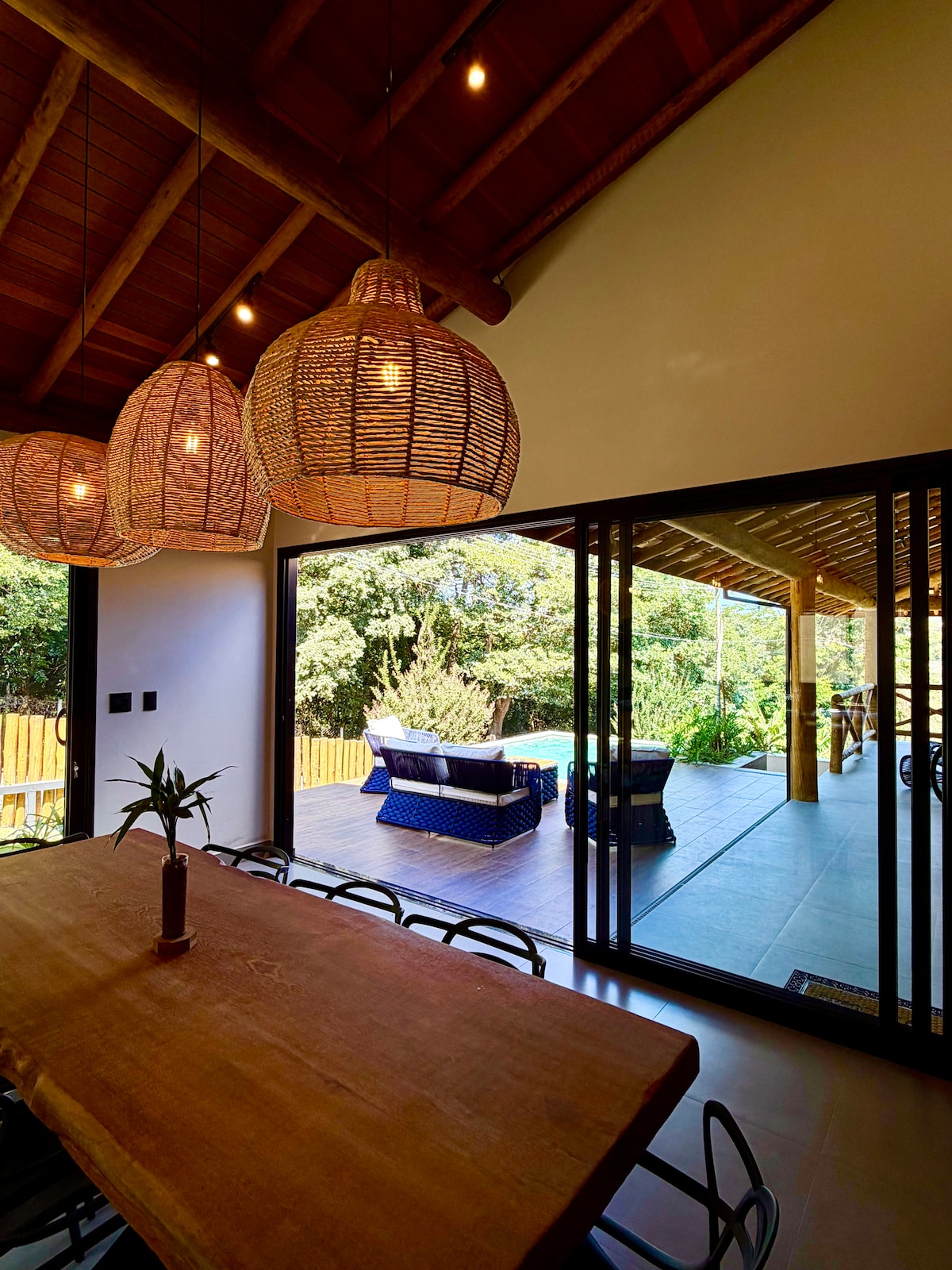 Casa de 120 m² em meio à natureza do antigo parque aquático de Ilhabela, com 2 suítes aconchegantes com Smart TV 43" e ar quente/frio. Sala charmosa com Smart TV 65" e ar quente/frio. Cozinha completa com geladeira grande 430L Panasonic, Wi-Fi fibra 1000 Mbps e quintal privativo com churrasqueira e piscina natural privada. No andar superior, suíte com cama king com vista as estrelas, banheira e varanda. Varanda ampla com sinuca, rede e ponte para o mirante das cachoeiras.