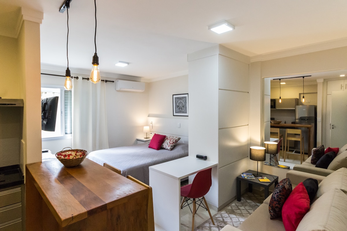 Curta uma experiência incrível em um aconchegante Studio novinho. Studio muito bem equipado para estadia de um casal, com todos os utensílios novos. Ótima localização, perto do Shopping Frei Caneca, da Rua Augusta , Rua Consolação, de Hospitais renomados. Perto do Metro Higienópolis-Mackenzie para fácil locomoção. Caminhando para a Av. Paulista são apenas 12 minutos. O Espaço é Ideal para quem vem a negócios (coworking no prédio), turismo ou a procura dos hospitais e faculdades da região.