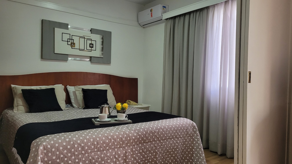 Apartamento completo com ar-condicionado no quarto, TV, cozinha compacta e varanda com vista incrível de São Paulo. Wi-Fi gratuito e limpeza diária. Prédio com recepção 24h, piscina, sauna, academia e jacuzzi coletiva. Estacionamento e café da manhã pagos à parte, servidos no restaurante do térreo. A uma quadra da Paulista, atrás do MASP, perto de tudo!