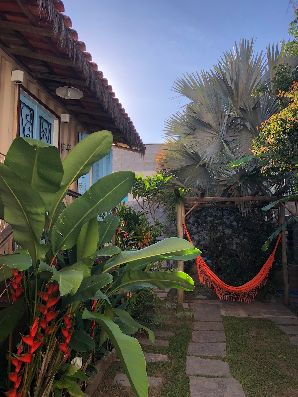 Suíte confortável e bem equipada para casal em propriedade compartilhada. Tem cama casal, TV com Chromecast, ventilador, ar condicionado, armário, roupas de cama/banho, cadeiras de praia, cooler e guarda-sol. Tem varanda com cozinha rústica. Na propriedade há chuveiro, deck, lavanderia, jardim e espaço para Luau compartilhados. Estamos a 800 m da praia Lagoinha e a 300 m das ruínas e cachoeiras. Há restaurantes, sorveterias e supermercados nas proximidades.