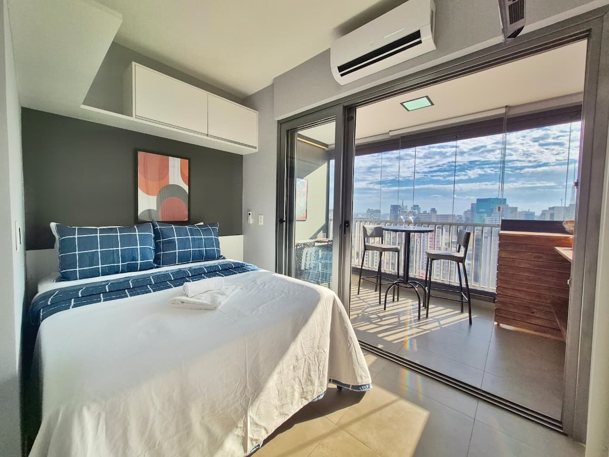 - Studio com 22m²; - 350m do metrô; - Ar Condicionado; - Wi-Fi; - Café expresso; - Microondas; - Air Fryer; - Geladeira duplex; - Fogão elétrico, panelas e utensílios; - Filtro de água; - Cama de casal; - Roupas de cama e banho alto padrão; -Chuveiro quente com alta pressão; - Secador de Cabelo; - Varanda com mesa e cadeiras, com vista; - Piscina e sauna no rooftop do prédio *Uso compartilhado* ( fechadas às segundas-feiras para manutenção) - Aeroportos: Congonhas (11 km), Guarulhos (26km)