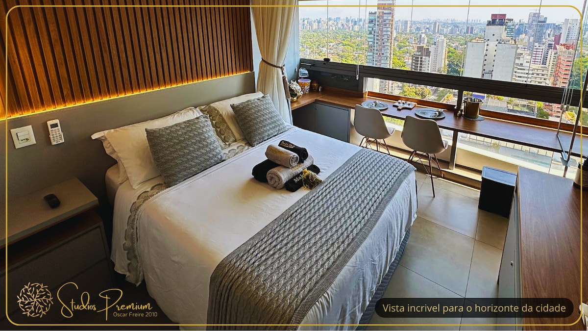 Studio de Luxo na Rua Oscar Freire Moderno, sofisticado e completo, na rua mais famosa de São Paulo pelas lojas de luxo. Studio no 24º andar, de frente, com vista magnifica para Av Paulista. Bem equipado, com TV 55 polegadas, Wifi Internet Vivo Fibra 200, TV a cabo, Ar Condicionado silencioso, Cafeteira, Cooktop e Frigobar, Cortina black-out automatizada, Vaporizador de roupa portátil, Utensílios de cozinha, Secador de cabelo, Lençóis e Toalhas macios, sabonete e kit shampoo/condicionador.