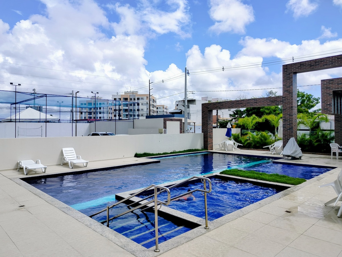 ☀️ Viva dias inesquecíveis em Aracaju! Apê novo, decorado com charme e totalmente equipado: 2 quartos, 2 banheiros, cozinha completa, ar-condicionado, smart TV, wi-fi e espaço para trabalhar. Sacada perfeita para brindar a vida! O condomínio é um verdadeiro clube: piscina refrescante, quadra de areia, academia, cinema, playground, brinquedoteca, mercadinho, estacionamento e portaria 24h com reconhecimento facial. A 5 min da Praia de Aruana e 10 min da Orla de Atalaia e do aeroporto.