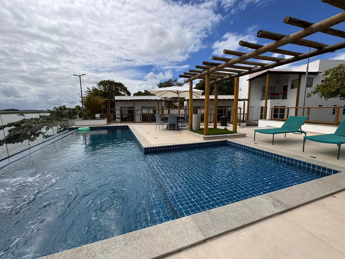 Relaxe com toda a família nesta acomodação tranquila que conta com 6 suítes. A casa fica à beira do rio vaza barris, a 60 km de Aracaju indo de carro e a 10 min de embarcação saindo da orla por do sol, no mosqueiro. Muito confortável, está decorada e equipada com todos os itens domésticos, alem de ter 2 cozinhas e 2 salas de estar. Piscina e área gourmet(c churrasqueira) privativas, além de piscina e churrasqueira na área de lazer do condomínio, com lindo pier as margens do rio vaza barris.