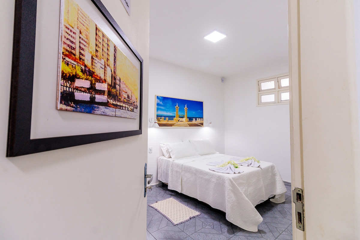 FAMÍLIA (3 pessoas) A maior suíte da casa é destinada a família. Comporta até 03 pessoas (uma cama casal e outra solteiro), adaptada para pessoas com mobilidade reduzida, com portas largas e banheiro privativo. Conta com ar-condicionado, TV, Wi-Fi, jogo de cama, cobertores, toalhas e café da manhã incluídos no valor do dia a dia.