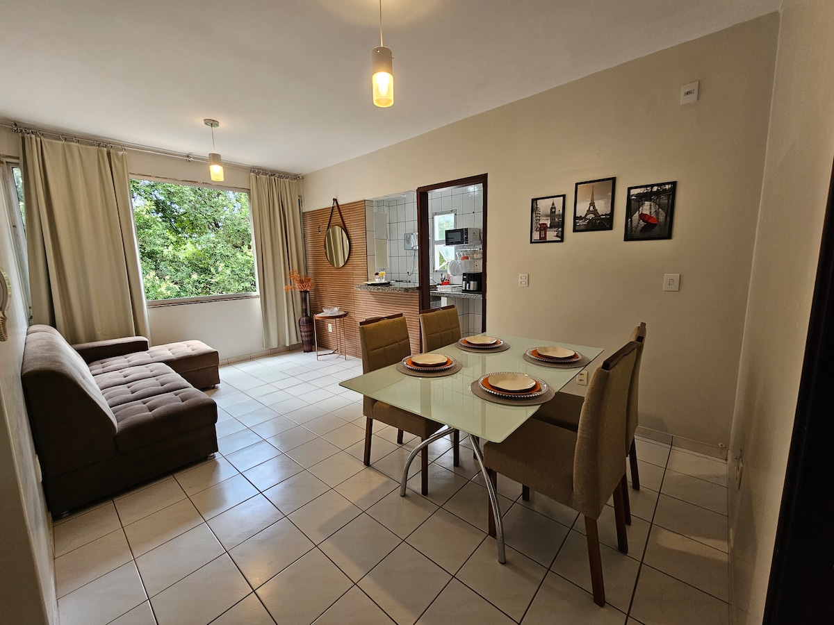 Sala de estar e jantar integrada com mesa para até 4 pessoas! Piscina ( Finais de semana agendado)Cozinha e lavanderia integradas, geladeira frost free, fogão Elétrico, microondas, estacionamento individual, sistema de monitoramento 24 horas, elevador, Wi-fi individual, Netflix, 2 quartos com ar-condicionados, Sofá Cama, chuveiro elétrico, secador, ferro, roupa de cama e banho, fechadura eletrônica.