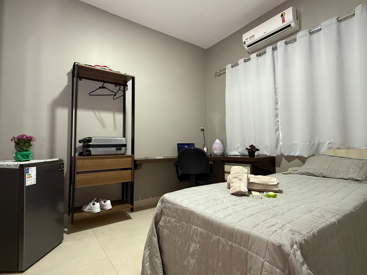 Uma casa completa, suite com cama Queen e 1 cama solteiro, numa casa com sala, Tv 55" cozinha completa, lavabderia, no centro da cidade com garagem para carro grande, portao eletrônico. Um lugar completo e acolhedor. Espaço limpo, confortável e pronto pra te receber em Palmas!