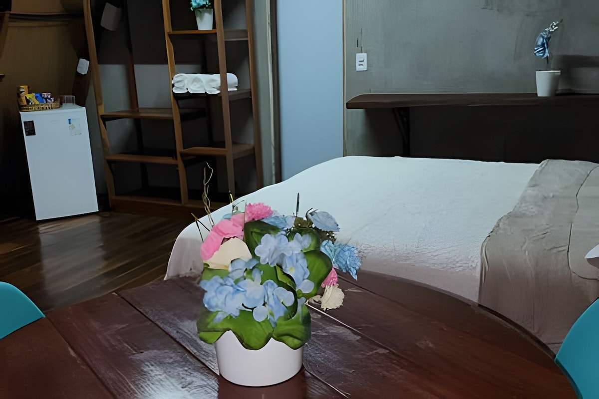 Fique à vontade com conforto neste lugar espaçoso todo rústico, temos cama de casal, ar-condicionado, wa-fi, frigobar, TV, chuveiro quente, o quarto e nas alturas tem escada que dar acesso ao banheiro, totalmente só do casal ou individual, servimos um delicioso café da manhã