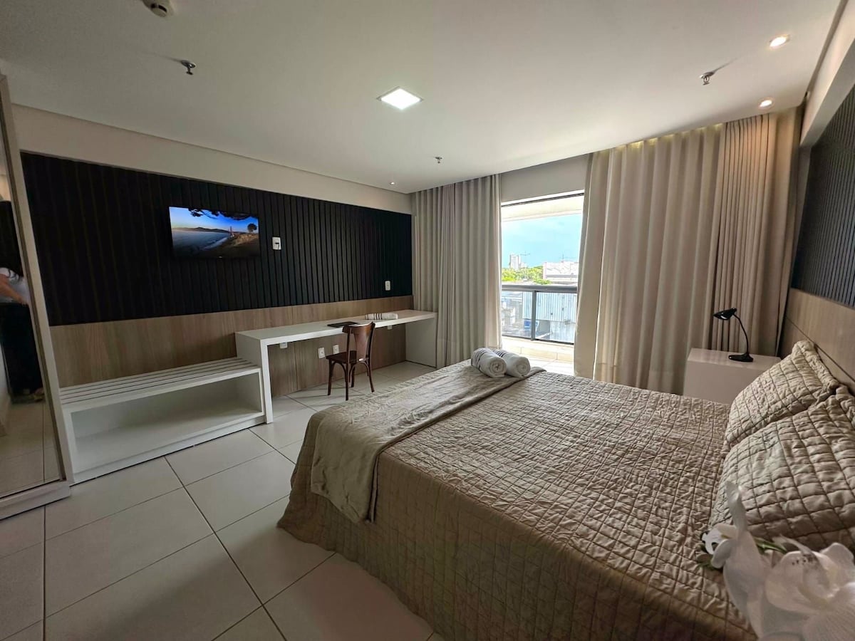 Flat espaçoso e confortável, ambiente totalmente integrado, contendo ambiente compartilhado de dormitório com rack de TV entre o quarto e sala de estar e um balcão para a cozinha no estilo americano. Ambiente perfeito para hospedagem de casais e viajantes à trabalho. O Flat acomoda até dois adultos em cama de casal Quen Size. Familias que possuem uma criança de até 12 anos podem optar por acomodada-la no sofá cama disponível na sala sob consulta e taxa adicional.
