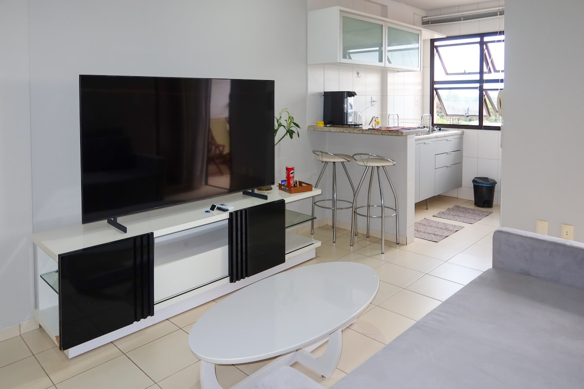 aconchegante espaço com cozinha conpleta, banheiro, quarto e sala equipado para suas necessidades básicas. Disponibizamos roupas de cama e banho, material básico de limpeza, varal, ferro e tábua de passar roupas. A área de lazer com academia, piscina aquecida e sala de sinuca, pode usada pelos hóspedes. Nossa internete de boa qualidade permite ao hóspedes trabalhar em home office. OBS: NA SEGUNDA A PISCINA ESTÁ FECHADA PARA USO EM RAZÃO DA MANUTENÇÃO O CHEK IN NO SÁBADO É APENAS DEPOIS DE 20 HORAS