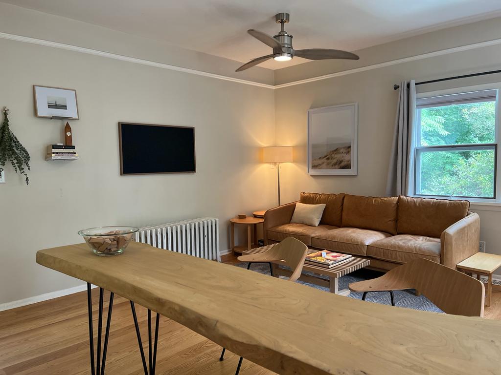 This cozy, updated two bedroom apartment mixes midcentury modern and vintage furniture with an organic, upstate NY vibe. The stylish first floor apartment of a classic Ithaca home, nestled into the highly walkable Fall Creek neighborhood. Just a few short blocks from Ithaca Falls, with easy access to Cornell, Ithaca College, and downtown. We took inspiration from boutique hotels when designing this space, with recently renovated bathroom and kitchen, new appliances, smart TV and luxury linens.
